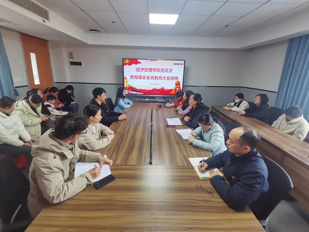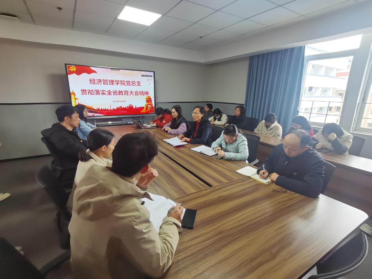 3月6日下午,经济管理学院党总支在西一教学楼613A会议室召开全体党员会议,专题学习全省教育大会精神,研究部署贯彻落实工作。会议由学院党总支书记刘惠玲主持,经管学院全体师生党员参加。