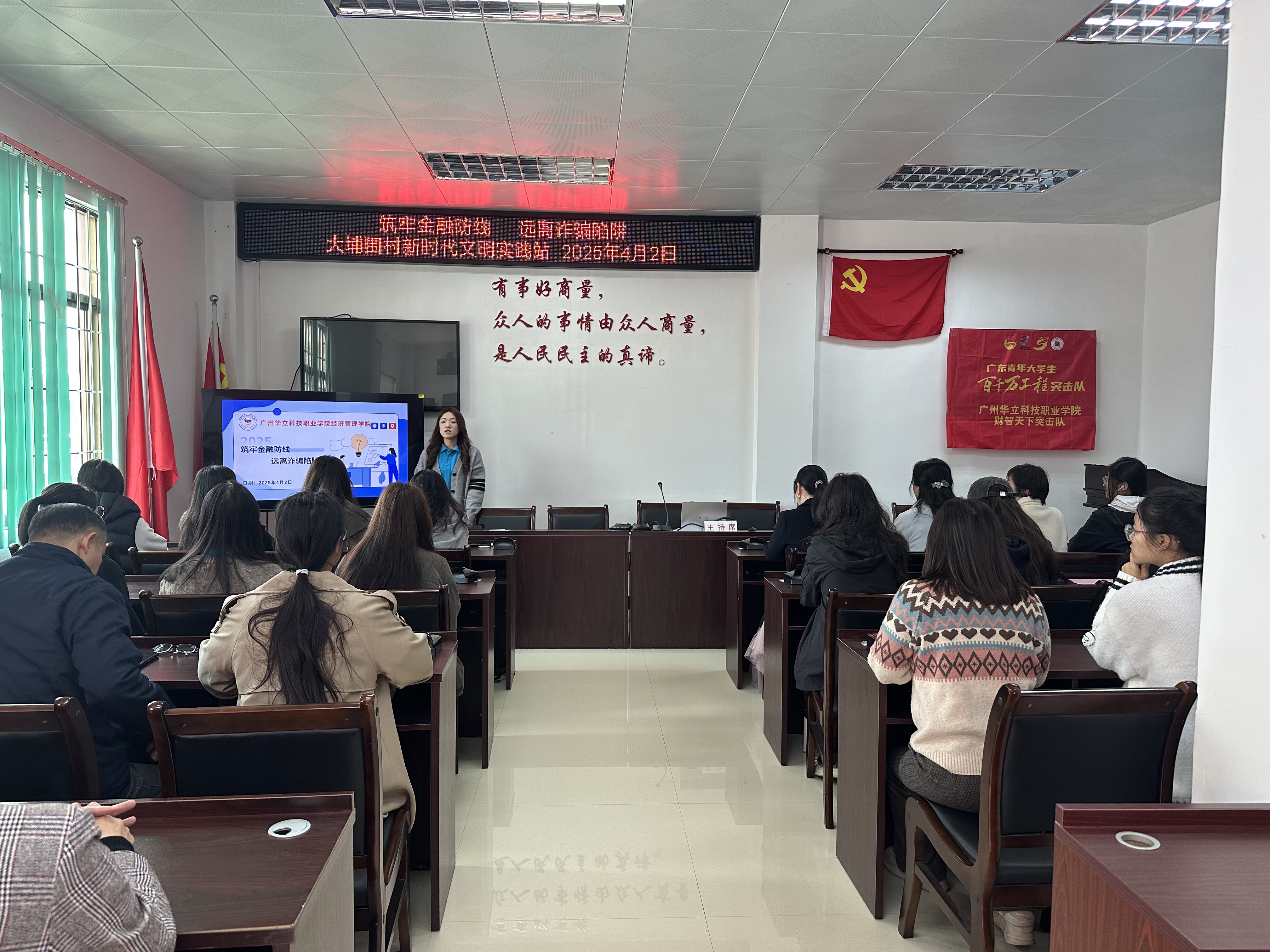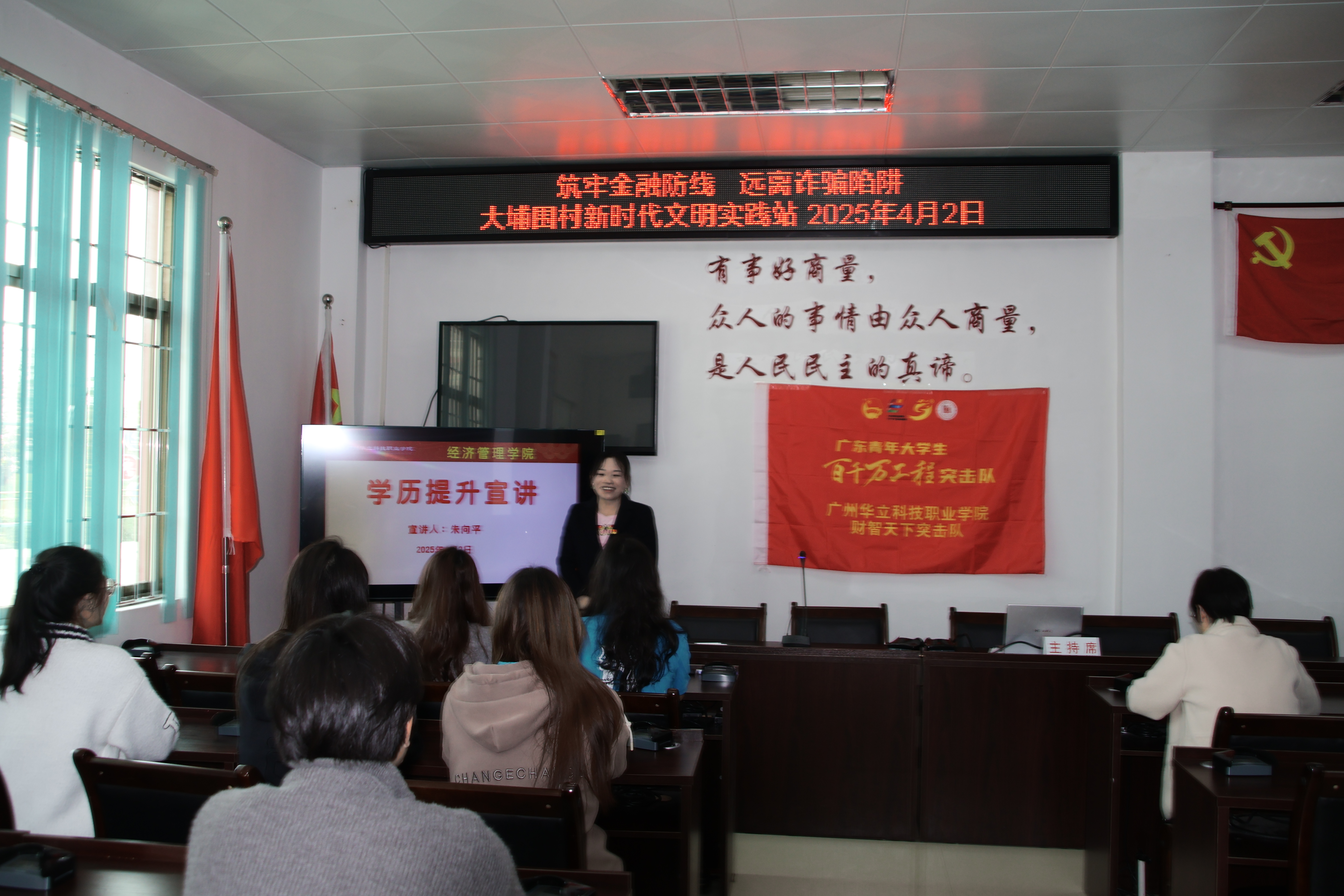 为积极响应国家乡村振兴战略,提升乡村居民的金融防范意识与学历认知水平,2025年4月2日,广州华立科技职业学院经济管理学院院长兼党总支书记刘惠玲亲自率师生团队,走进增城区增江街大埔围村,开展了一场别开生面的金融防诈骗与学历提升讲座,为乡村发展注入知识力量。