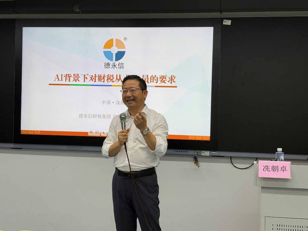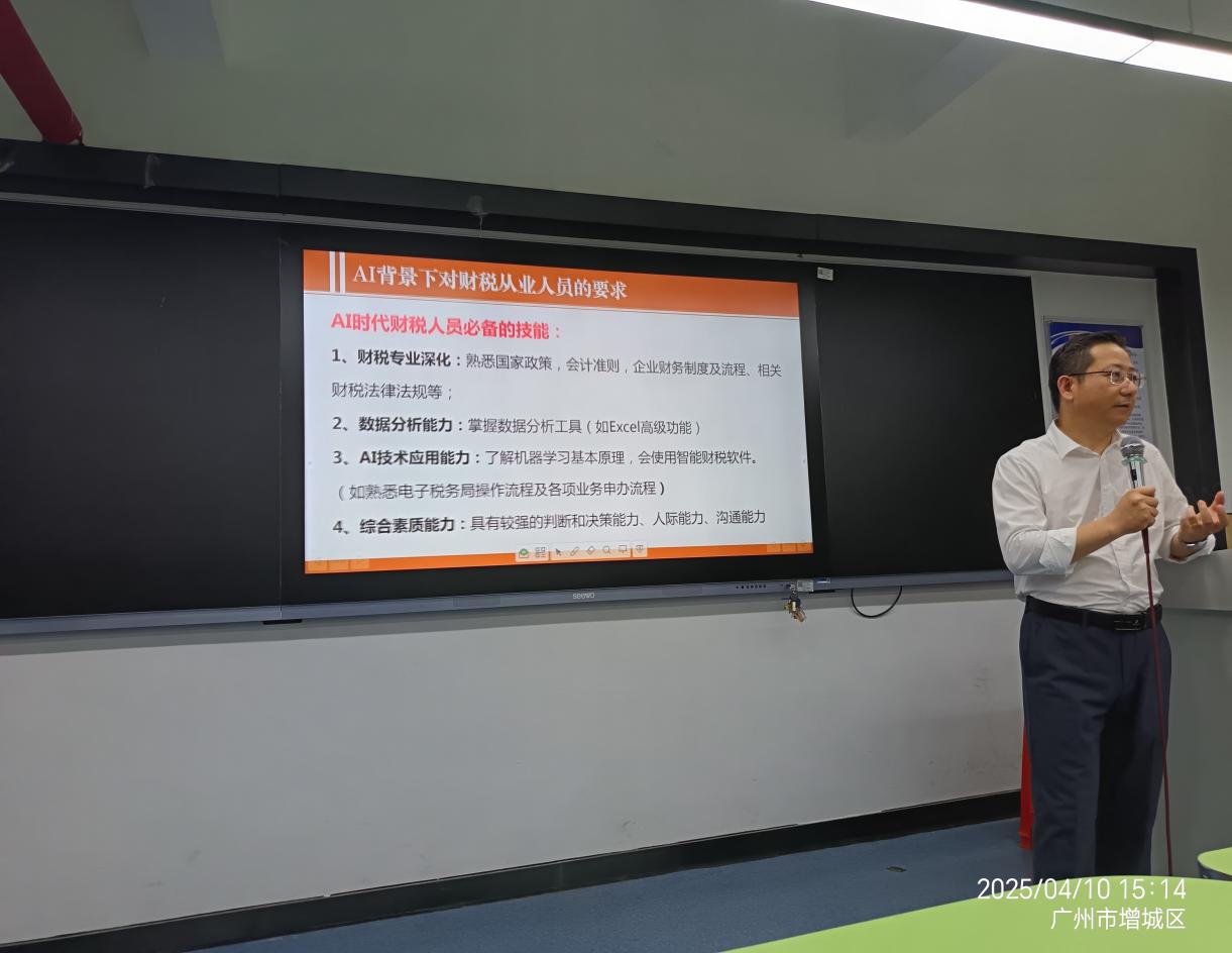 AI时代背景下,为了让同学们破除认知壁垒、避免职业危机,引导他们精准学习,提升就业竞争力同时激发他们的职业认同感与转型信心。2025年4月10日下午,经济管理学院特邀深圳市德永信税务师事务所总经理兼党支部书记冼朝卓同志,在西三211教室成功举办了主题为“AI背景下对财税从业人员的要求”的专题讲座,此次讲座吸引了众多师生积极参与。