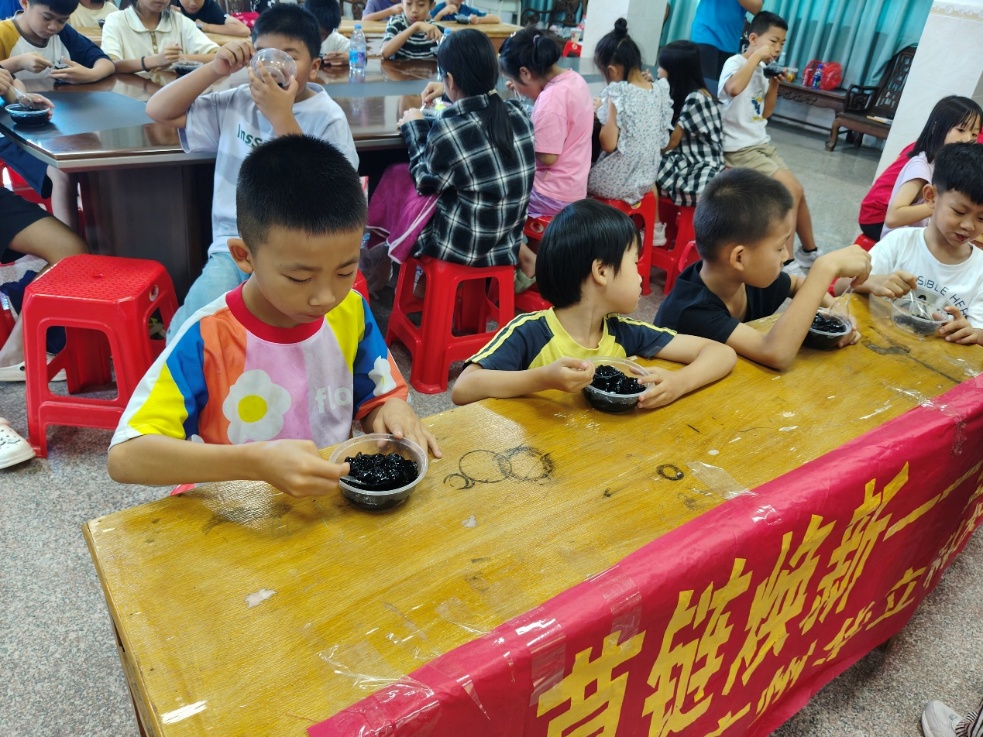 在品尝环节,更是热闹非凡。孩子们小心翼翼地舀起一块黑凉粉,放进嘴里,冰凉滑嫩的口感在舌尖化开,带着恰到好处的甜味,瞬间驱散了夏日的燥热。“哇,好好吃!”“像果冻一样!”孩子们的欢呼声此起彼伏,有的小朋友吃得嘴角沾了黑凉粉,像只小花猫,引得大家哈哈大笑。他们互相分享着自己碗里的凉粉,你一口我一口,那份简单的快乐在课室内里传递开来。