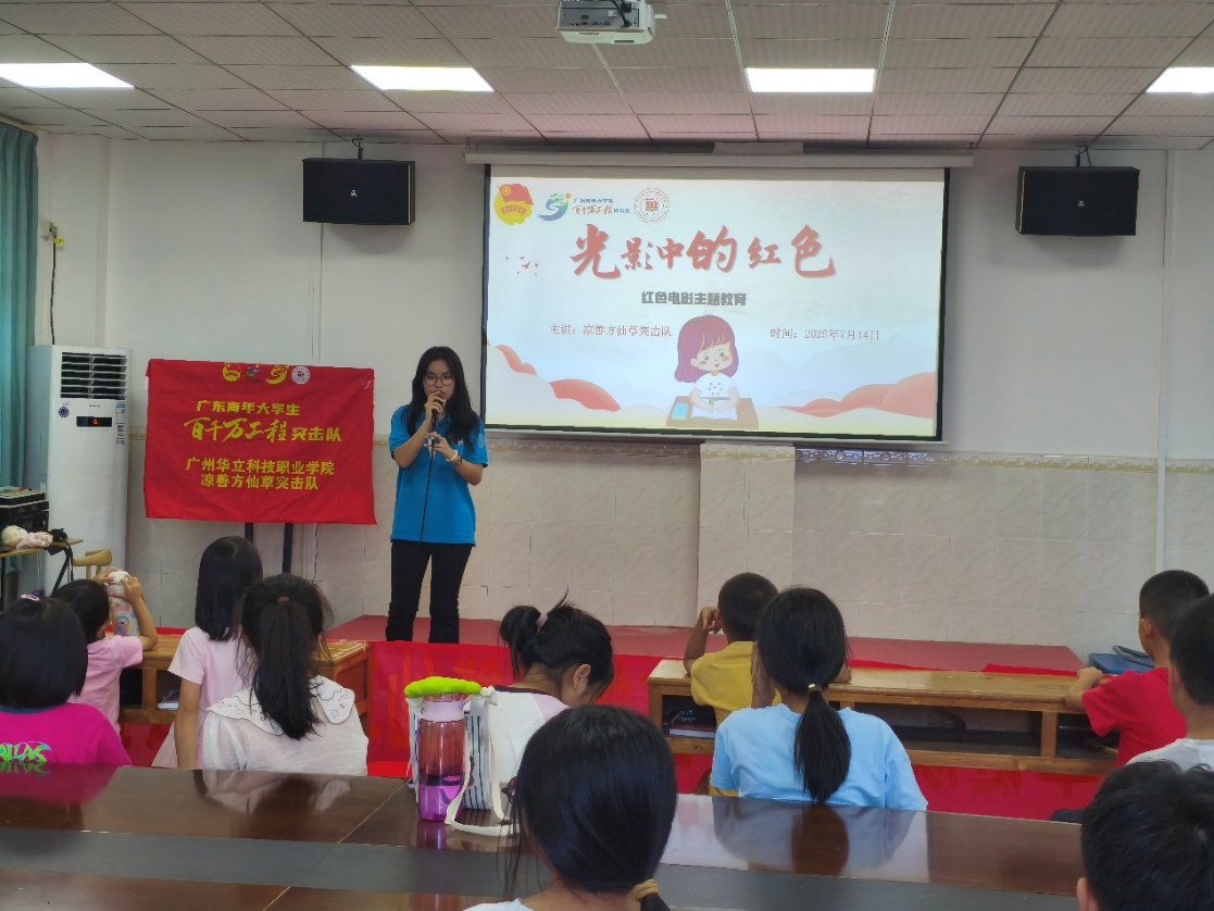 2025年7月15日,广州华立科职业学院经济管理学院“百千万工程”三下乡凉善方仙草突击队在增城区陆村村开展“光影中的红色”主题教育活动,通过组织孩子们观看红色电影、开展热烈讨论、分享心得感悟,让红色基因在光影流转中浸润童心。