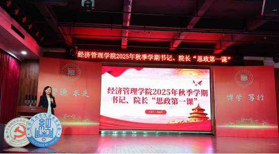 9月2日上午,经济管理学院在图书馆8楼举行2025年秋季学期书记、院长“思政第一课”。学院党总支书记、院长刘惠玲同志以“铭记伟大胜利,汲取奋进力量”为主题,通过回溯历史、解读精神、展望未来三大篇章,为25级全体新生带来一堂立体生动的专题党课。党课由党总支专职副书记谢晓慧同志主持,学院全体辅导员、24级学生代表及25级全体新生参加学习。
