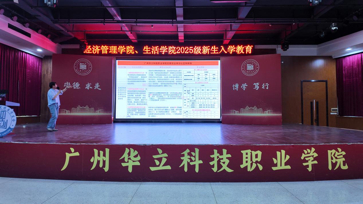 2025年9月5日上午,经济管理学院与生活学院在广州华立科技职业学院图书馆8楼报告厅联合举办了2025级新生创新创业教育宣讲会。会议由学院创新创业竞赛负责人洪耿彬老师主讲。