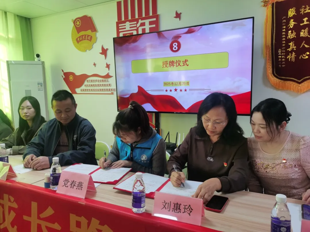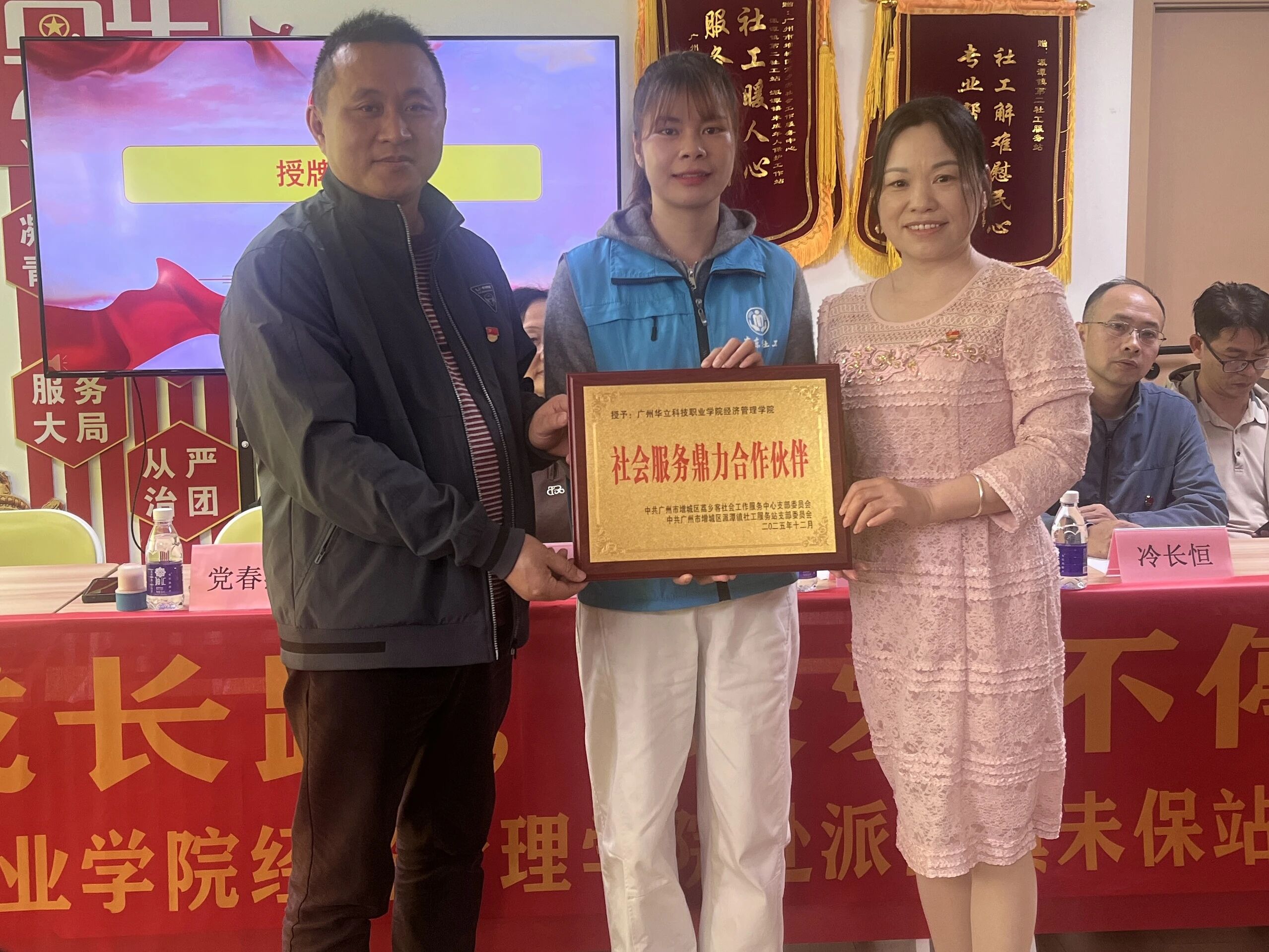 随后,爱心传递步入正式环节。经济管理学院党总支书记、院长刘惠玲作为捐赠方代表,与受赠方代表、派潭镇第二社工服务站主任党春燕郑重签署捐赠协议,将帮扶的承诺落到实处。生活学院院长李春洪、经济管理学院副院长朱向平从党春燕主任手中接过“社会组织鼎力合作伙伴”荣誉授牌。这枚授牌不仅是对学校公益行动的认可,更象征着校社携手关爱困境儿童的责任传递,彰显了高校服务社会的使命担当。
