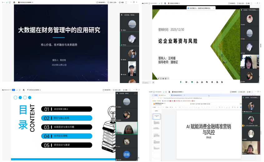 本次答辩经过前期严格筛选,共有9位来自不同专业的优秀毕业生代表参加。本次答辩采用线上线下结合方式。答辩过程中,同学们围绕各自的论文选题,通过清晰的陈述、详实的数据分析和完整的逻辑论证,展示了在校期间扎实的专业知识、熟练的技能应用以及将理论联系实际解决问题的能力。论文选题紧密契合“大数据+”时代背景,覆盖智能财务分析、金融风险数据建模、数字化金融服务创新等多个前沿领域,体现了专业群紧跟行业发展趋势、注重跨学科融合培养的特色。