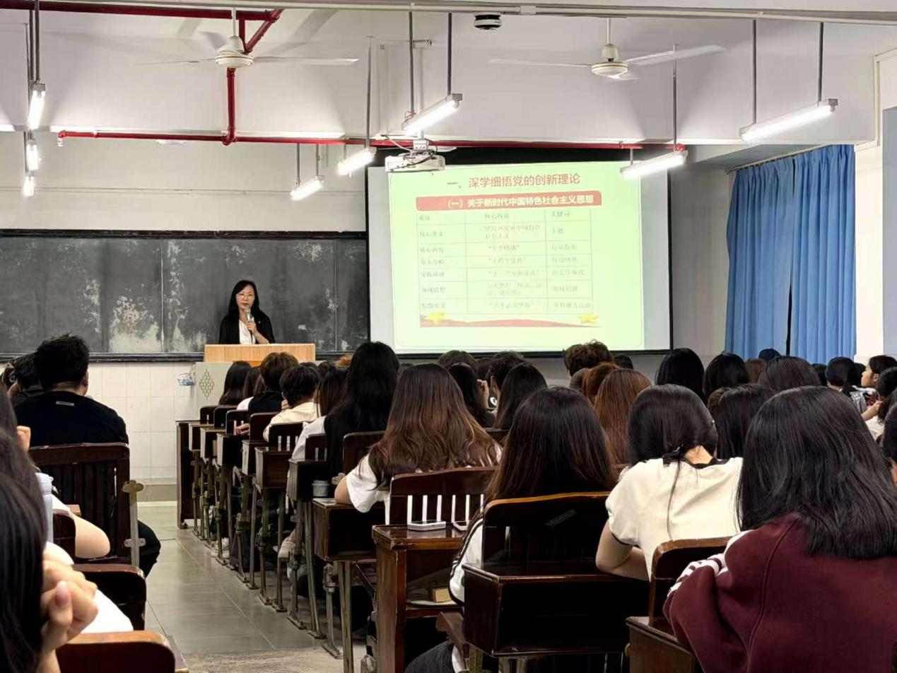 讲座伊始,刘惠玲书记首先从理论维度阐释习近平新时代中国特色社会主义思想精髓要义,指出新时代是中华民族从站起来、富起来到强起来的伟大飞跃时代,中国特色社会主义建设之“强”体现在全方位跃升,勉励同学们在学思践悟中坚定理想信念。解读“十五五”新发展征程时,刘书记带领师生回顾“十四五”成就,介绍“十五五”规划五大原则并阐释核心内容,强调新质生产力是推动高质量发展核心动力,鼓励青年学子拥抱科技革命、练就过硬本领。立足广东实际,刘书记回顾了习近平总书记对广东嘱托,称广东作为改革开放前沿,肩负推进中国式现代化建设走在前列使命,希望同学们感悟关怀,将个人发展融入广东发展大局。