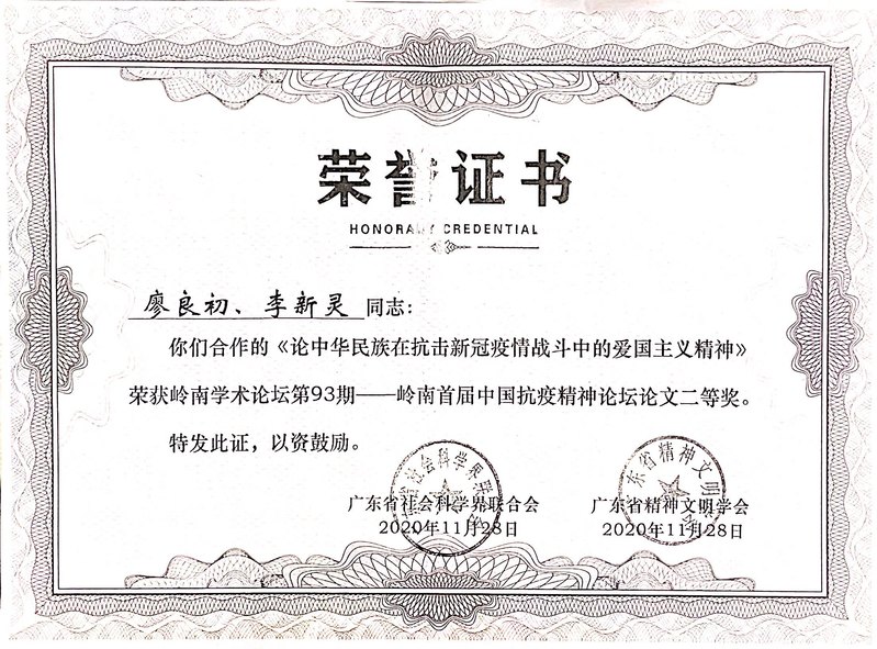 廖良初、李新灵获岭南首届中国抗疫精神论坛征文二等奖