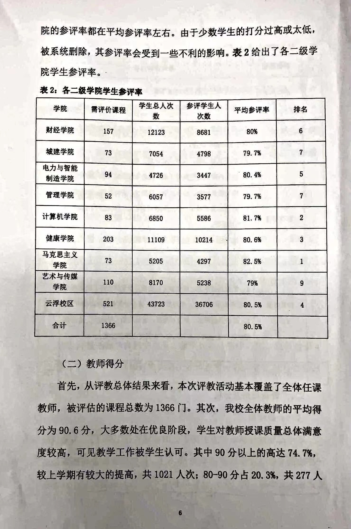 为了掌握全校老师的教学情况,实现教学质量监控,提高教学质量,2022年1月3日至14日,学校教务处、督导处组织全校学生对全体任课教师的教学情況进行了测评。此次测评指标为教学态度(15%)、教学内容(35%)、教学方法(25%)、教学效果(25%),参与测评的课程1366门。马克思主义学院开设的《毛泽东思想和中国特色社会主义理论体系概论》、《思想道德与法治》、《形势与政策》三门课程得最高分,获全校学生参评率第一名。