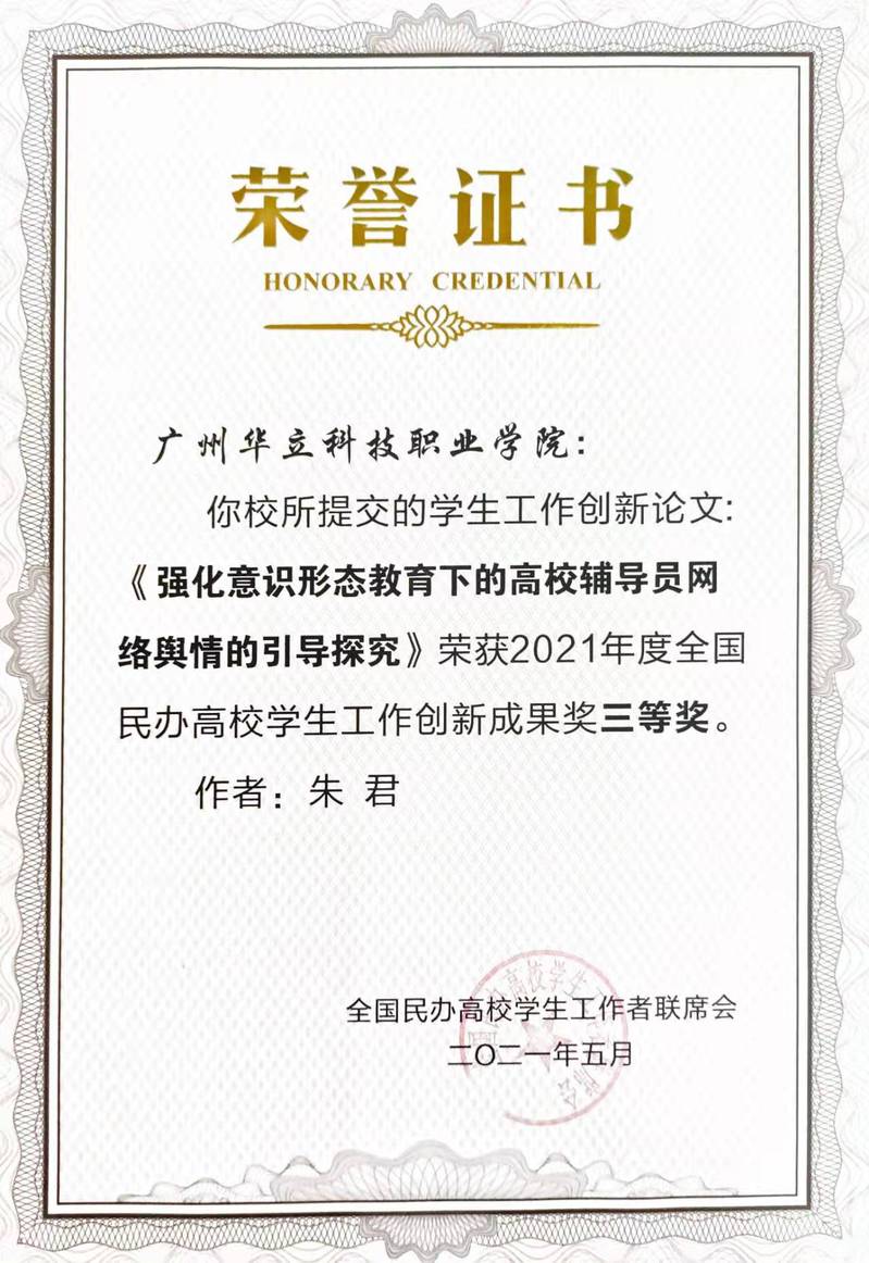马克思主义学院朱君老师荣获2021年度全国民办高校学生工作创新成果奖三等奖