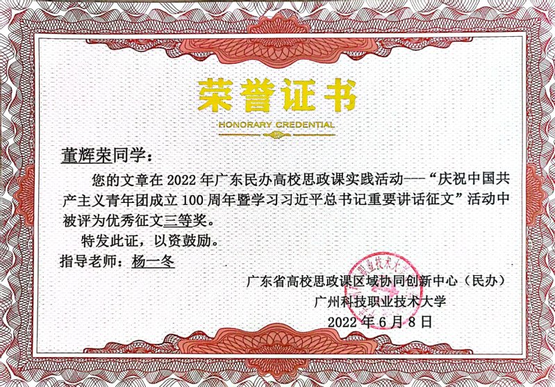 教师杨一冬指导学生在建团百年征文活动中被评为优秀征文三等奖
