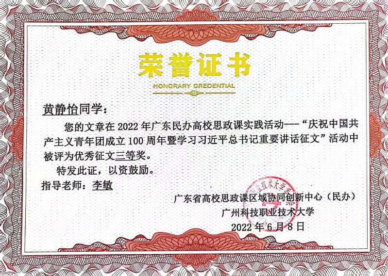 马克思主义学院教师李敏指导学生在建团百年征文活动中被评为优秀征文三等奖