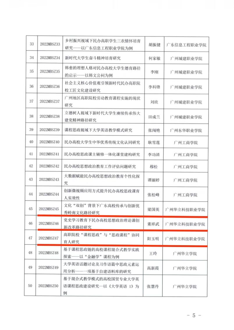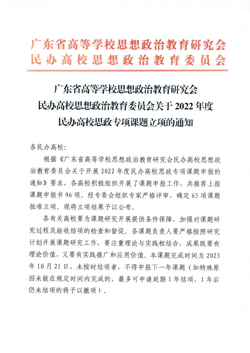 近日,广东省高等学校思想政治教育研究会民办高校思想政治教育委员会发布了关于2022年度民办高校思政专项课题立项的通知,经各高校积极组织申报,共推荐上报课题申报书96项。由各专委会组织专家严格评审,确定65项课题批准立项。我校马克思主义学院梁国英老师、董祥武老师、阳玉明老师申报的课题获得立项,项目批准号分别为2022MBSZ45、2022MBSZ46、2022MBSZ47。