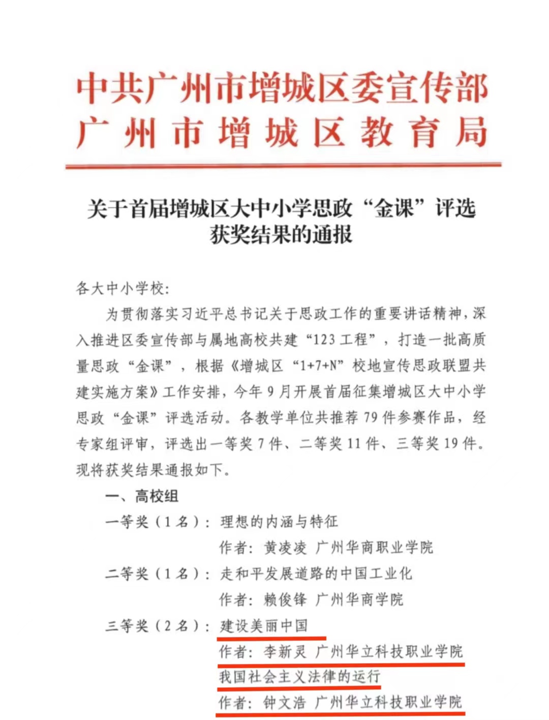 为贯彻落实习近平总书记关于思政工作的重要讲话精神,打造一批高质量思政“金课”,根据《增城区“1+7+N”校地宣传思政联盟共建实施方案》工作安排,今年9月开展首届征集增城区大中小学思政“金课”评选活动。近日,中共广州市增城区委宣传部广州市增城区教育局发布关于首届增城区大中小学思政“金课”评选获奖结果的通报。各教学单位积极组织参加,共推荐79件参赛作品,经专家组评审,评选出一等奖7件、二等奖11件、三等奖19件。我校马克思主义学院李新灵老师、钟文浩老师荣获高校组三等奖。