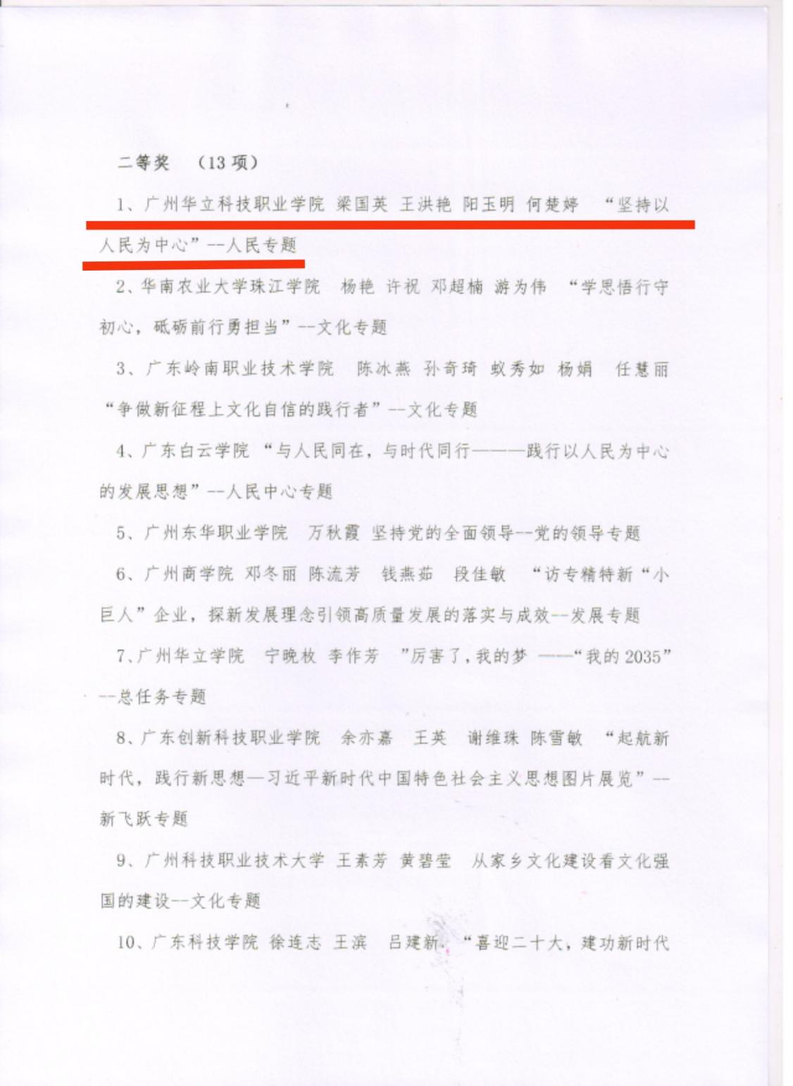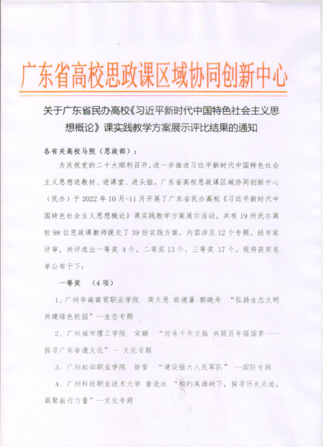 为了进一步推进习近平新时代中国特色社会主义思想进教材、进课堂、进头脑,广东省高校思政课区域协同创新中心(民办)于2022年10月-11月开展了广东省民办高校《习近平新时代中国特色社会主义思想概论》课实践教学方案展示活动,共有19所民办高校98位思政课教师提交了39份实践方案,内容涉及12个专题。经专家评审,共评选出一等奖4个,二等奖13个,三等奖17个。我校马克思主义学院梁囯英、王洪艳、阳玉阳、何楚婷四位老师合作的作品:《坚持以人民为中心——实践教学方案》荣获二等奖。