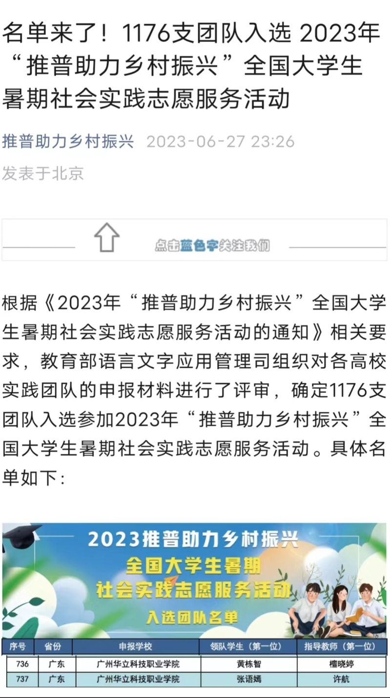 喜讯:马克思主义学院许航老师指导的学生志愿者团队成功入选教育部语言文字应用管理司、共青团中央青年发展部组织的2023年暑期开展“推普助力乡村振兴”全国大学生署期社会实践志愿活动项目。