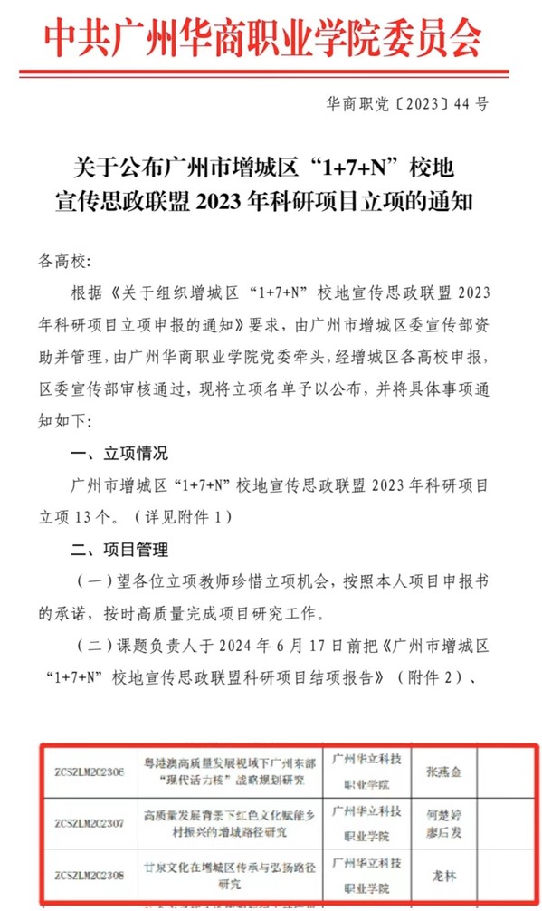 近日,由广州市增城区区委宣传部牵头组织的增城区校地宣传思政联盟,发布了《关于组织“1+7+N”2023年科研项目立项申报通知》(华商职党【2023】44号),经增城区各高校申报,区委宣传部审核通过,共有13个项目立项。我校马克思主义学院张燕金副教授主持的《粤港澳高质量发展视域下广州东部“现代活力核”战略规划研究》(ZCSZLM202306)、何楚婷副教授、廖后发老师主持的《高质量发展背景下红色文化赋能乡村振兴的增城路径研究》(ZCSZLM202307)、龙林副教授主持的《甘泉文化在增城区传承与弘扬路径研究》(ZCSZLM202308)课题获得立项。