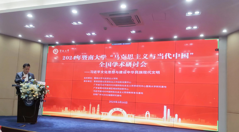 2024年3月16日,由教育部高校思想政治工作创新发展中心等单位承办、暨南大学马克思主义学院主办的2024年暨南大学“马克思主义与当代中国”全国学术研讨会,在暨南大学石牌校区举办。大会研讨的主题是“习近平文化思想与建设中华民族现代文明”。本次研讨会汇聚了来自全国各大高校和科研院所的近200位专家学者,其中包括中央马克思主义理论研究和建设工程首席专家、中国文化软实力研究中心主任张国祚,暨南大学党委常委、副校长张宏,中山大学原党委副书记李萍,教育部长江学者、中国人民大学教授侯衍社等重量级嘉宾。与会人员还包括北京师范大学、中央财经大学、吉林大学、黑龙江大学、国防科技大学、上海师范大学、武汉大学、中国政法大学、南开大学、贵州大学等机构的代表,共同就相关议题展开深入探讨。我校马克思主义学院院长廖良初教授、教科研主任张燕金副教授应邀参加会议。