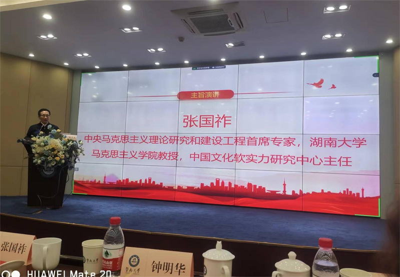 中央马克思主义理论研究和建设工程首席专家、中国文化软实力研究中心主任张国祚教授做主旨发言。他指出,暨南大学“忠信笃敬”四字校训所传递的价值理念,与中华优秀传统文化高度契合,与习近平文化思想提出的新的文化使命一脉相承。他表示,在习近平总书记“3·18”重要讲话五周年来临之际召开本次研讨会,具有非凡的意义。随后,张教授围绕“习近平文化思想的原创性理论贡献”进行了深刻地阐述,对如何全面、科学、准确把握习近平文化思想做了高水平的学术报告。