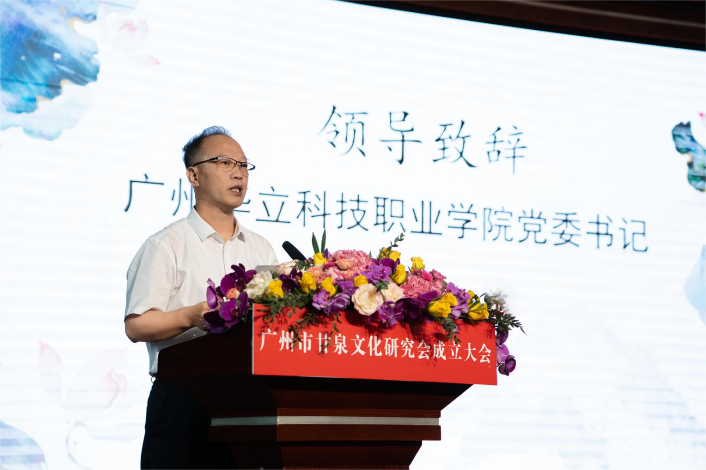 广州华立科技职业学院陈良声书记在致辞中对广州市甘泉文化研究会的成立表示最诚挚的祝贺,并强调教育是文化传承与创新的重要阵地,广州华立科技职业学院将全力以赴支持广州市甘泉文化研究会的各项工作,争取多出研究成果,出好研究成果,不断丰富甘泉思想文化体系。