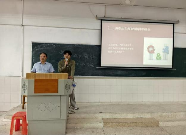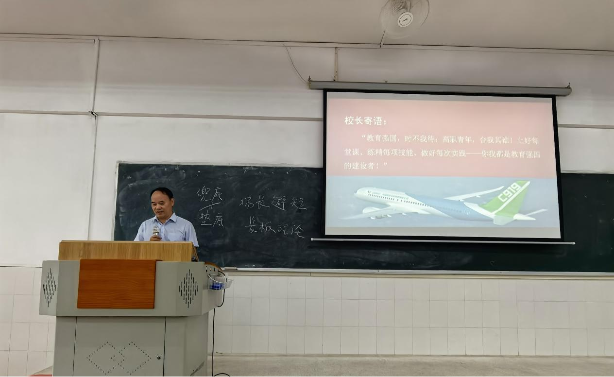 廖校长强调,职业教育是与普通教育同等重要的教育类型,是国民教育体系和人力资源开发的重要组成部分。高职毕业生占新增就业人口70%,制造业一线技术骨干80%来自高职,职业教育已成为教育强国的“半壁江山”,职业教育大有可为。在互动环节,他提出“作为高职学生,你认为自己在教育强国中能扮演什么角色”等问题,引发学生深思。他引用习近平总书记的青年寄语:“青年一代有理想、有本领、有担当,国家就有前途,民族就有希望”,鼓励学生立大志、明大德、成大才,将个人成长融入国家发展。