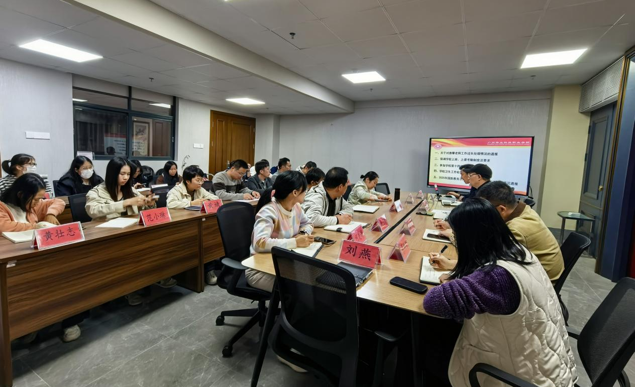 为加强学院团队精神建设,增强集体荣誉感,廖良初院长结合学校第十四届运动会我院教师参加情况进行了总结。他肯定了老师们在活动中展现出的良好精神风貌和集体荣誉感,并对个别老师借身体不舒服拒绝参加运动会的行为提出了批评。会议还通报了近期学校卫生工作检查评比结果,客观分析了我院在此次评比中未能获奖的原因,并号召全体教师共同维护整洁优美的教学办公环境,从细节入手提升学院整体形象。