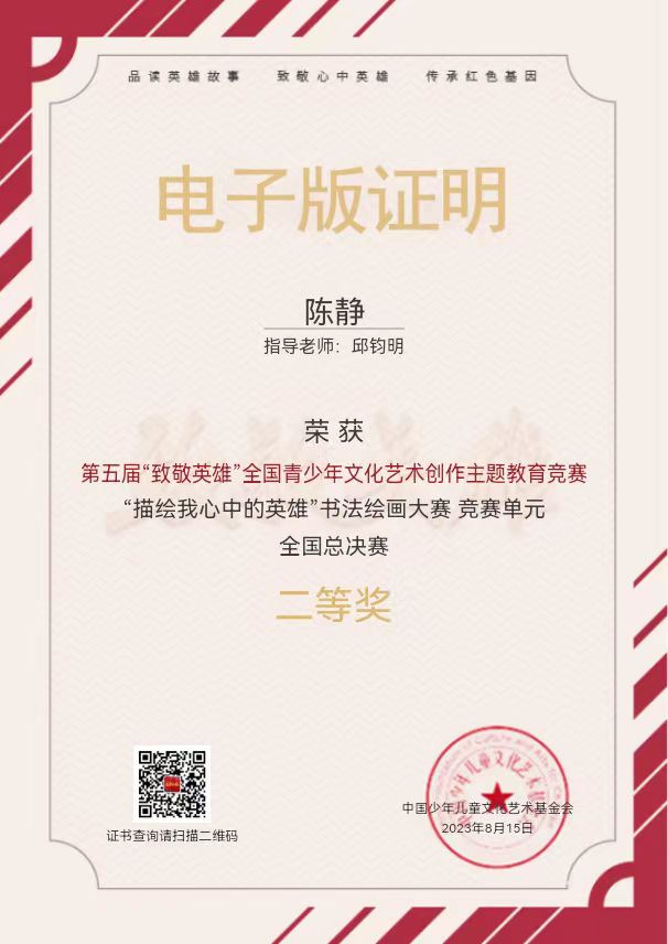 近日,在第五届“致敬英雄”全国青少年文化艺术创作主题教育竞赛“描绘我心中的英雄”书法绘画大赛中,由教育学院邱钧明老师精心指导的学前教育专业21级学生陈静创作的作品获全国总决赛二等奖。