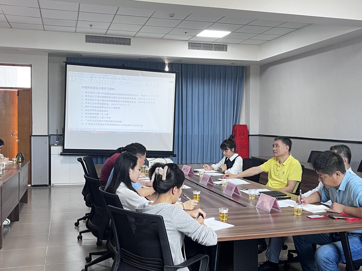 会议认真学习了《新时代高校教师职业行为十项准则》、《华立园十要十不准》等有关文件精神,与会教师围绕主题作交流发言。专职教师代表刘瑞阳表示,师德是教育工作者的灵魂,只有拥有高尚的师德,才能够引导学生在人生发展道路上中始终秉持正义、公平和道德的立场;高校教师不仅是知识的传授者,更是学生的榜样和引路人。辅导员代表熊晨凤表示,作为一辅导员,要从培养人才的角度出发,积极教育引导学生树立科学的思想,正确的人生观、价值观等;要树立以学生为主体的服务意识,深入了解学生,共同营造相互尊重、信任、宽容、友爱的新型师生关系。