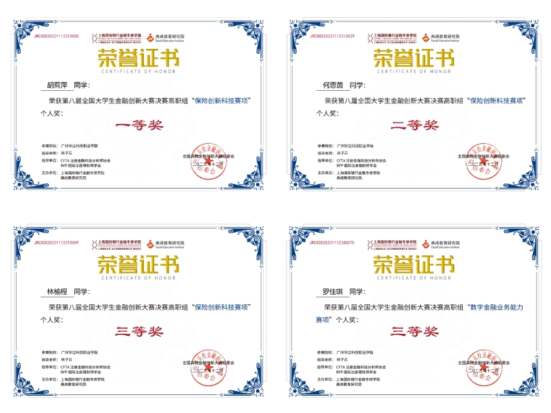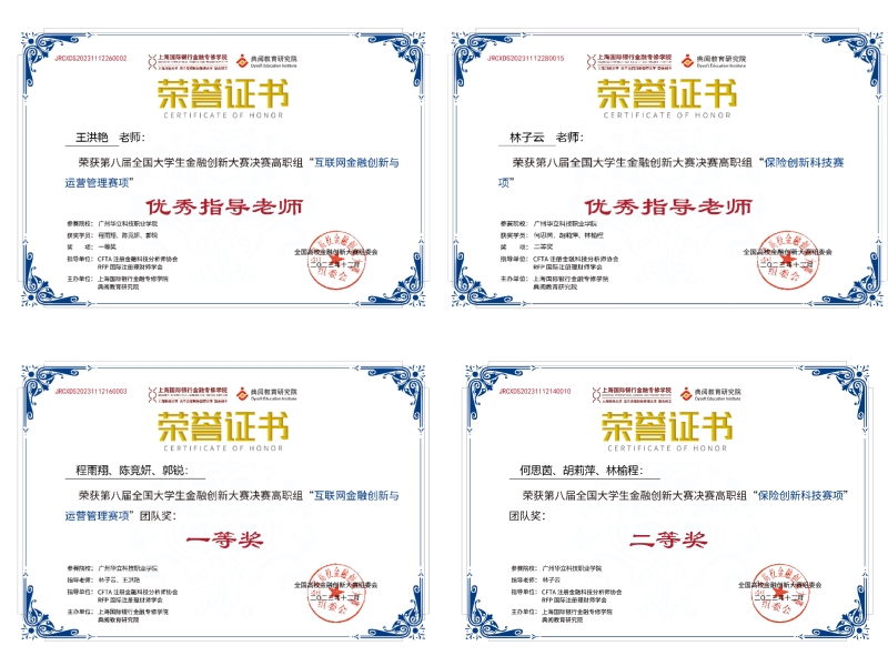 2023年全国大学生金融创新大赛圆满落幕。由上海财经大学和典阅教育研究院共同主办,CFTA注册金融科技分析师协会、RFP国际注册理财师学会指导的第八届全国大学生金融创新大赛赛果出炉,全国共有59所高校177支团队1090位选手入围总决赛,经过激烈角逐,云浮校区经管学院组织的两支代表队分别荣获团体赛一等奖1项、二等奖1项;个人赛一等奖1项、二等奖1项。三等奖2项,指导老师林子云、王洪艳获得“优秀指导教师”荣誉。