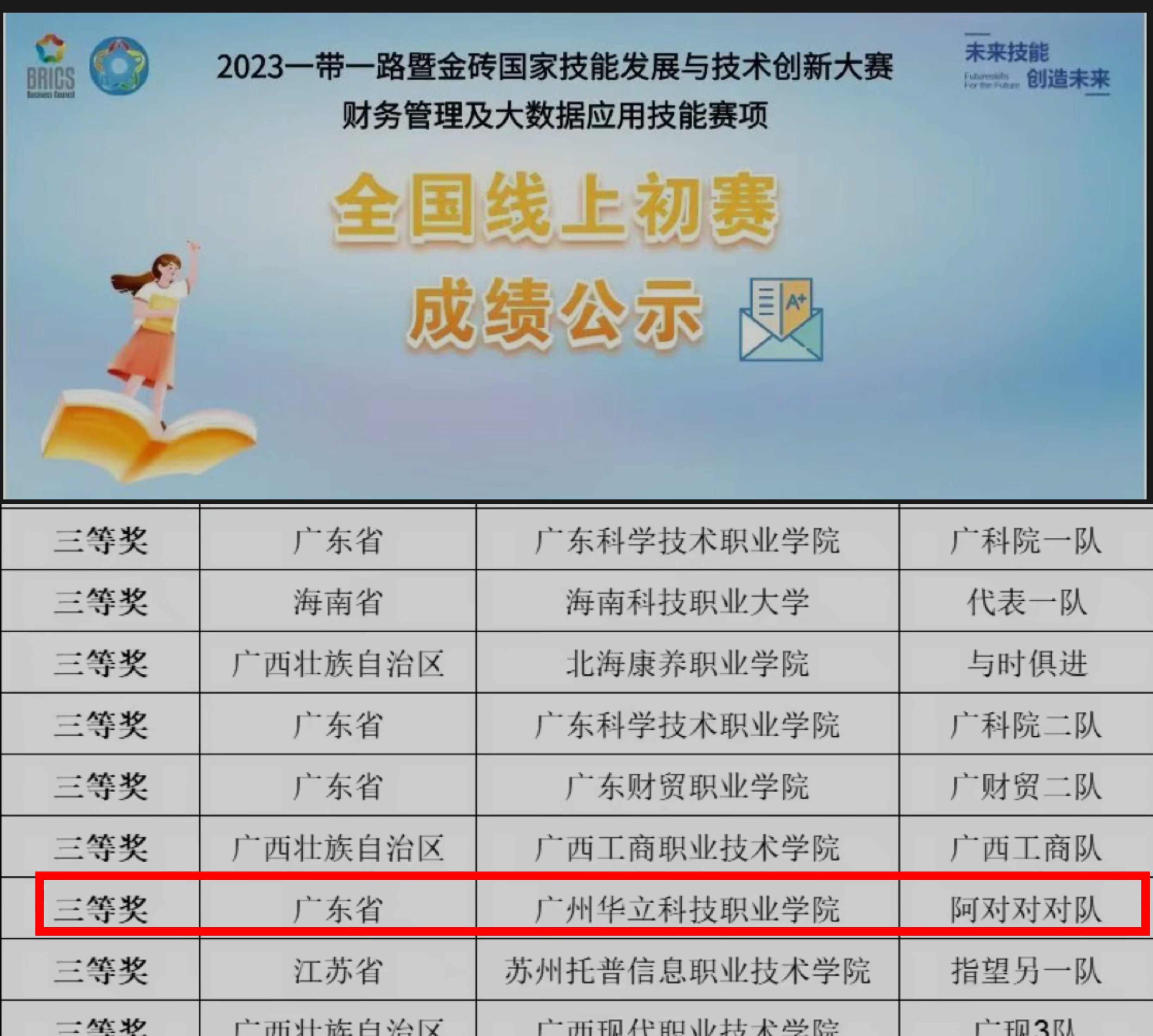 2023一带一路暨金砖国家技能发展与技术创新大赛——财务管理及大数据应用技能赛项的全国线上初赛落下帷幕。近100所学校约200支队伍报名参赛,最终选拔出70支晋级队伍,根据官网公示结果,我校胡莉萍,龚思琪,巫若婷同学荣获初赛三等奖成功晋级决赛。