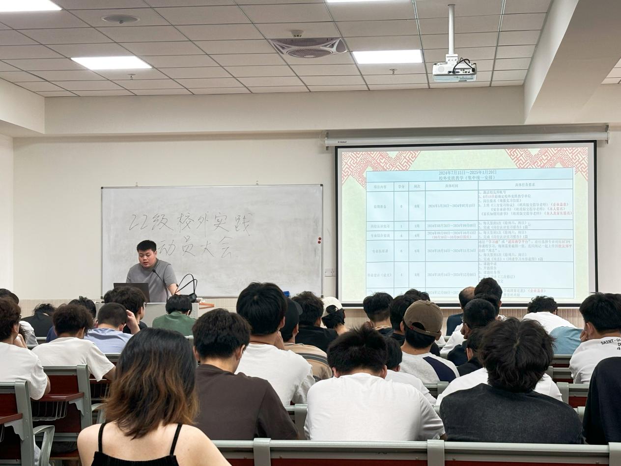 会上,马洪德副院长动员讲话,对即将进行校外实践教学的同学们表示热烈的祝贺,并鼓励他们勇往直前,迎接挑战。他强调了校外实践教学的重要性,认为校外实践教学是锻炼实践能力、增强职业素养、提升综合素质的重要途径。同时他对即将进行校外实践教学的同学们提出了几点建议和要求:一是要珍惜机会,认真对待每一项任务;二是要虚心学习,不断提高自己的专业技能和综合素质;三是要注重安全,遵守法律法规、遵守校外实践单位的规章制度;四是要保持与学校老师的联系,及时反馈学习情况。最后,他希望同学们通过本次校外实践可以不断提高自己的竞争力和适应能力。