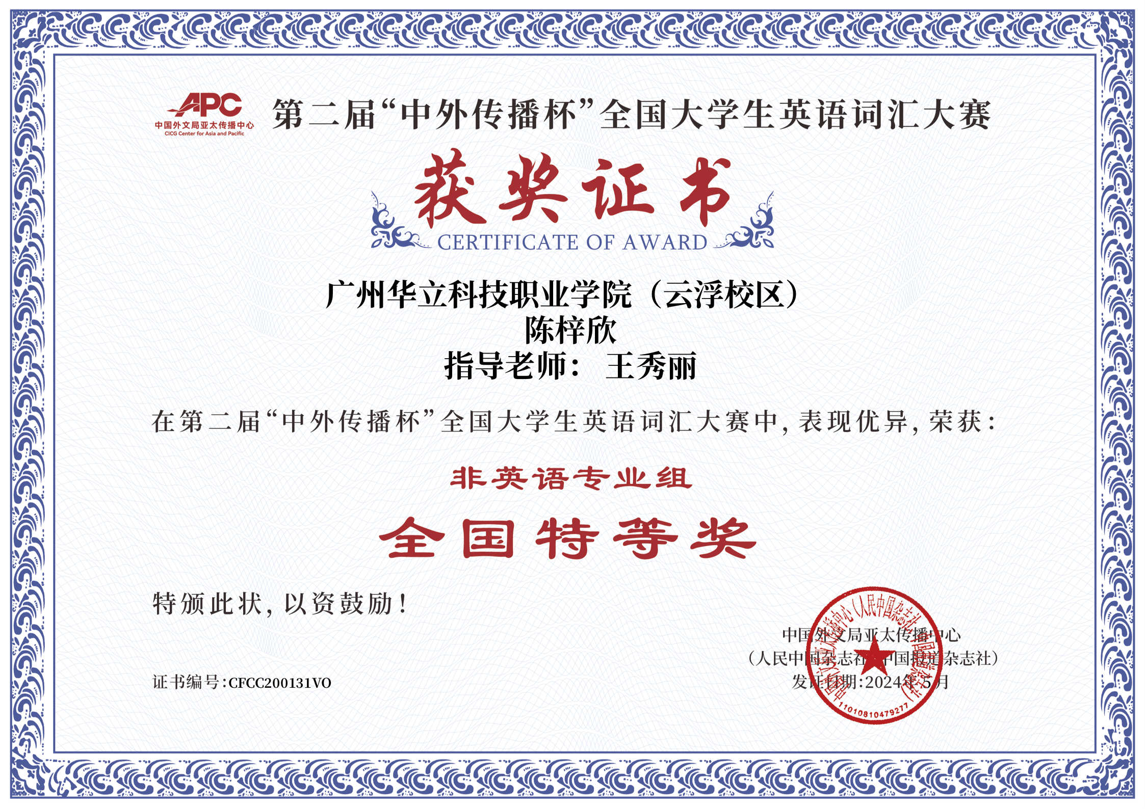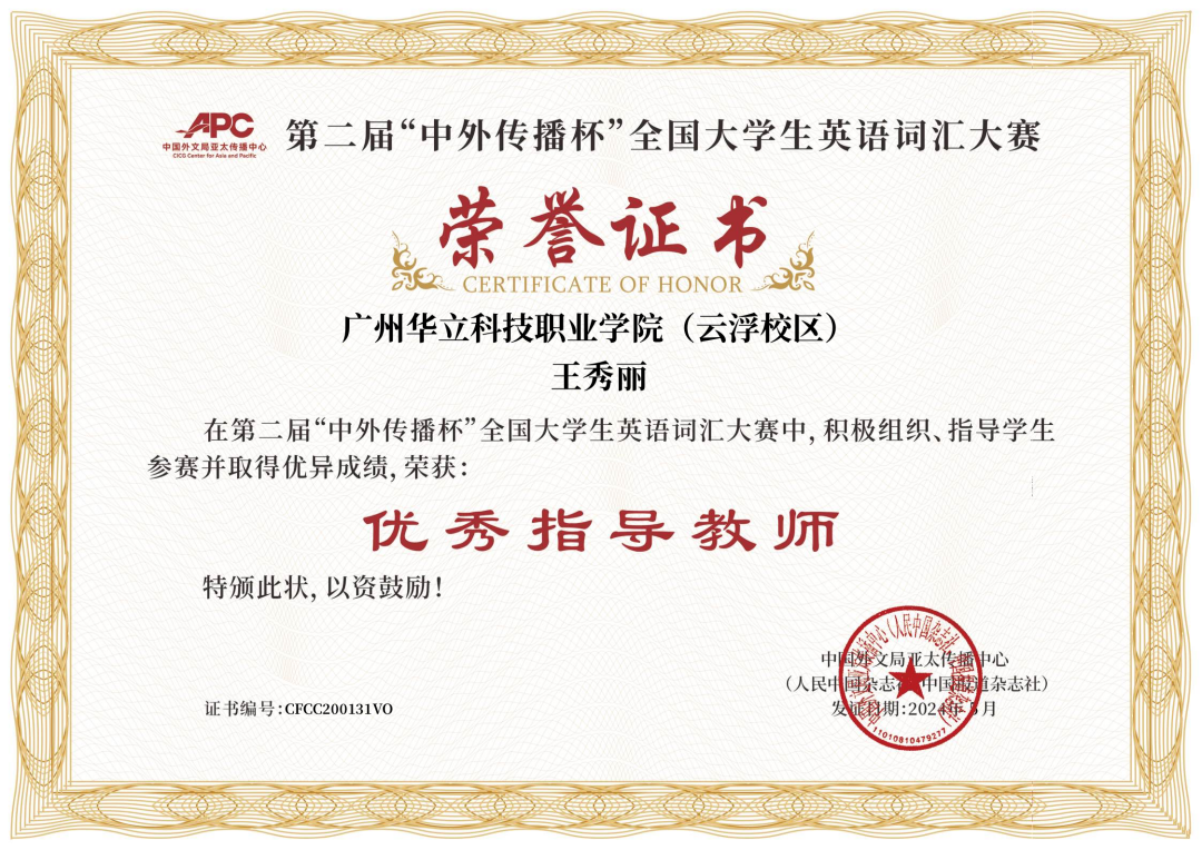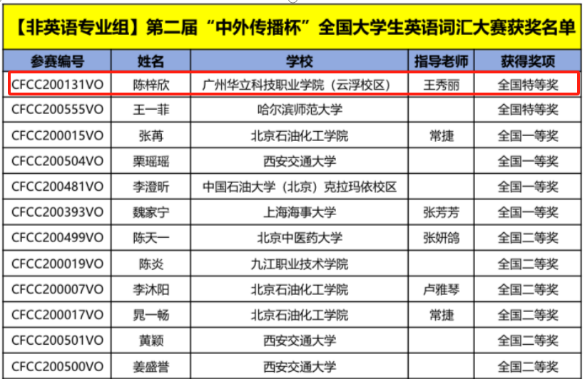 近日,第二届“中外传播杯”全国大学生英语词汇大赛传来捷报广州华立科技职业学院云浮校区经管学院2022级陈梓欣同学获得大赛非英语专业组全国特等奖,王秀丽老师获“优秀指导老师”称号,创造我校在该项赛事上的最好成绩!