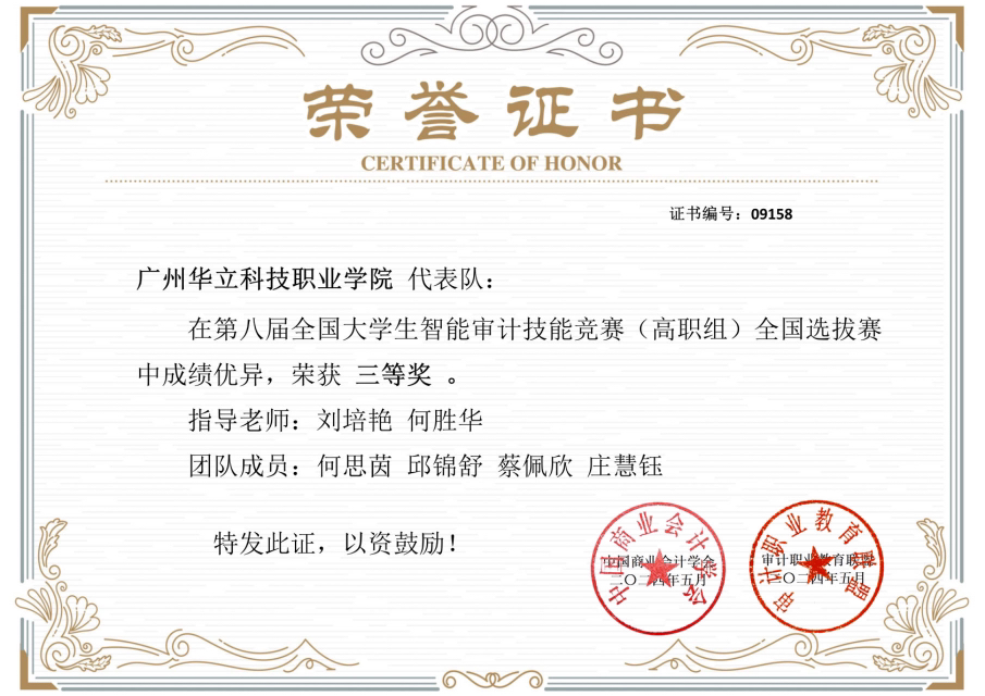 近日,由中国高等教育学会高等财经教育分会指导,中国商业会计学会、全国职业教育审计联盟联合主办的《第八届全国大学生智能审计技能竞赛全国选拔赛》结果公布,我校经管学院两支学生团队荣获大赛三等奖,分别是何思茵、邱锦舒、蔡佩欣、庄慧钰团队(由刘培艳、何胜华老师指导)和胡莉萍、龚思琪、黄诗羽、伍慧玲团队(由何胜华、钟文浩老师指导)。