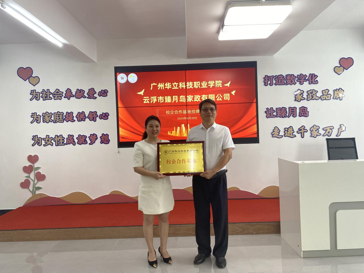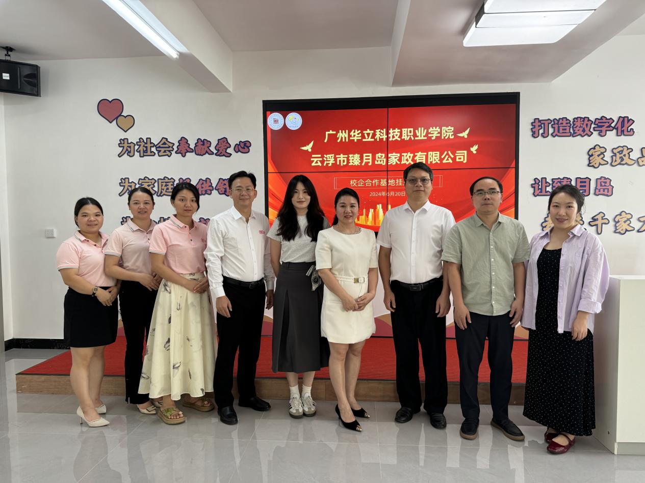 6月20日,广州华立科技职业学院现代家政服务与管理校企合作基地挂牌仪式在云浮市臻月岛家政有限公司举行。臻月岛家政品牌创始人曾潮芳、总经理詹峰,我校经管学院副院长刘军根、招生就业处副处长吴毅强,学院骨干教师宋彩娟、黄钰婷等参加活动。