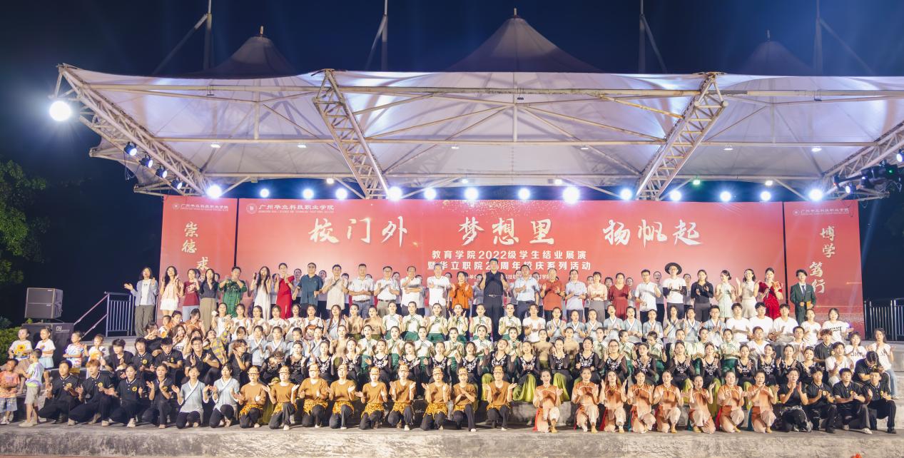 7月4日晚,广州华立科技职业学院教育学院2022级学生结业展演暨华立职院建校25周年校庆系列活动在我校云浮校区田径场精彩上演。学校党委副书记、副校长高尧来及各部门领导莅临现场观看。展演晚会采用线上和线下同步进行的方式,学校新媒体中心通过官微现场直播,吸引了全校师生1.2万人次观看了这场震撼人心的视觉盛宴。