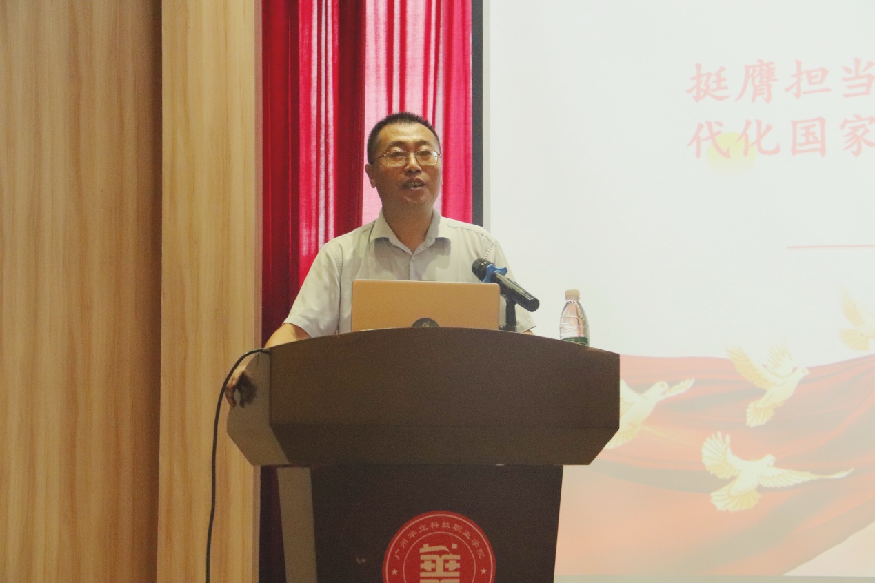 为深入学习贯彻党的二十届三中全会精神,增强同学们的家国情怀,培养担当精神,为青年学子们的成长成才之路奠定坚实的思想基础。2024年10月14日下午,学校党委副书记、副校长高尧来以《挺膺担当、奋发有为,为全面建设社会主义现代化国家、全面推进中华民族伟大复兴而奋斗》为题,在云浮校区图书馆一楼报告厅为同学们开讲新学期思政第一课。学生处副处长李同同、校团委副书记宋依谜,思政教师、2024级学生参加听课。