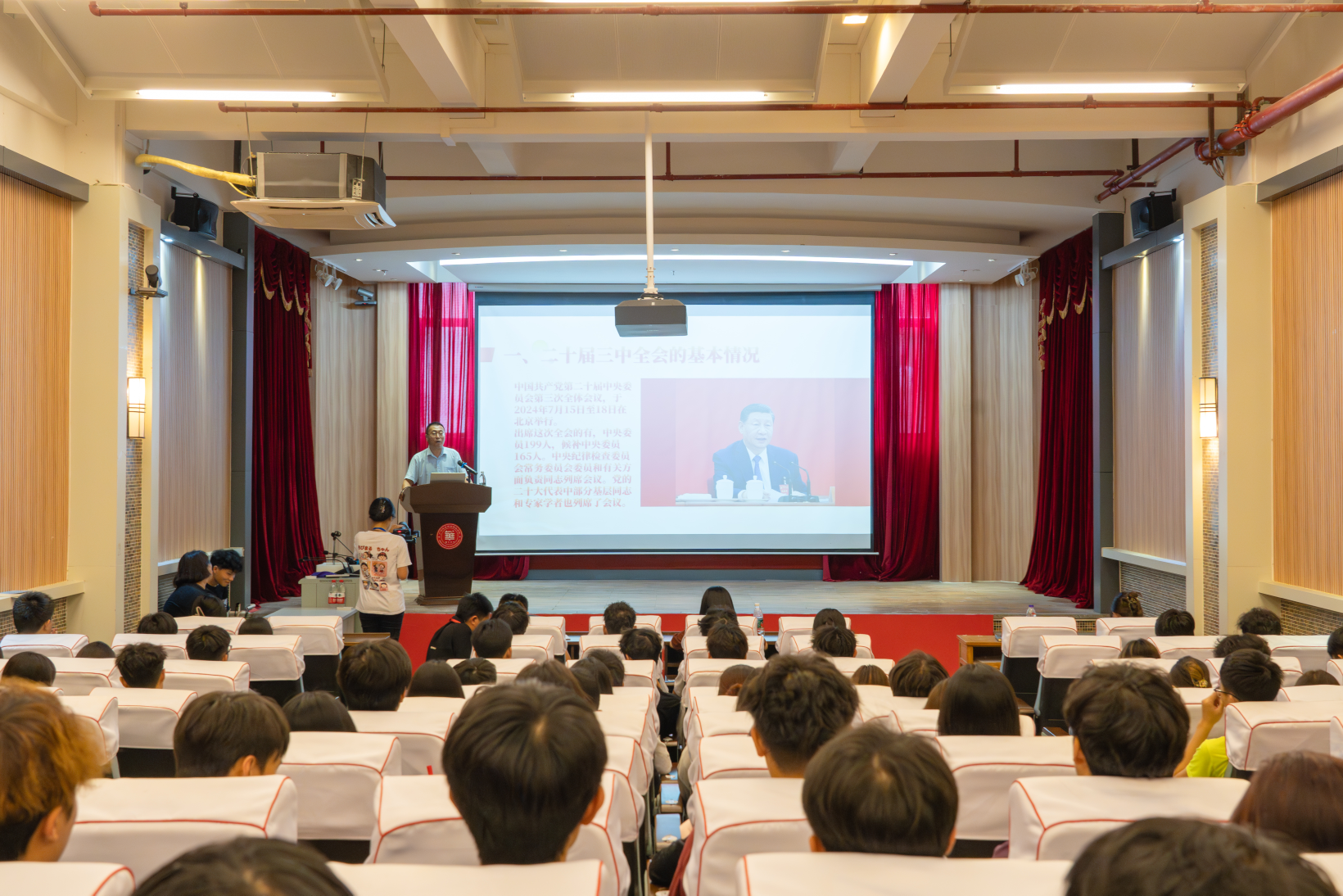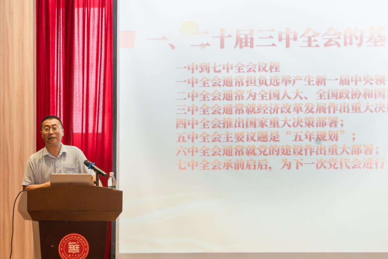 高尧来副校长以二十届三中全会的基本情况为开篇,深刻阐述了其重大意义,并以此为切入点,详细讲解了此次会议在关键时期所发挥的重要作用和《决定》的主要内容及总体结构。他指出,当前和今后一个时期是以中国式现代化全面推进强国建设、民族复兴伟业的关键时期。党的二十届三中全会站在新的历史起点上,科学谋划进一步全面深化改革,既是党的十八届三中全会以来全面深化改革的实践续篇,也是新征程推进中国式现代化的时代新篇。