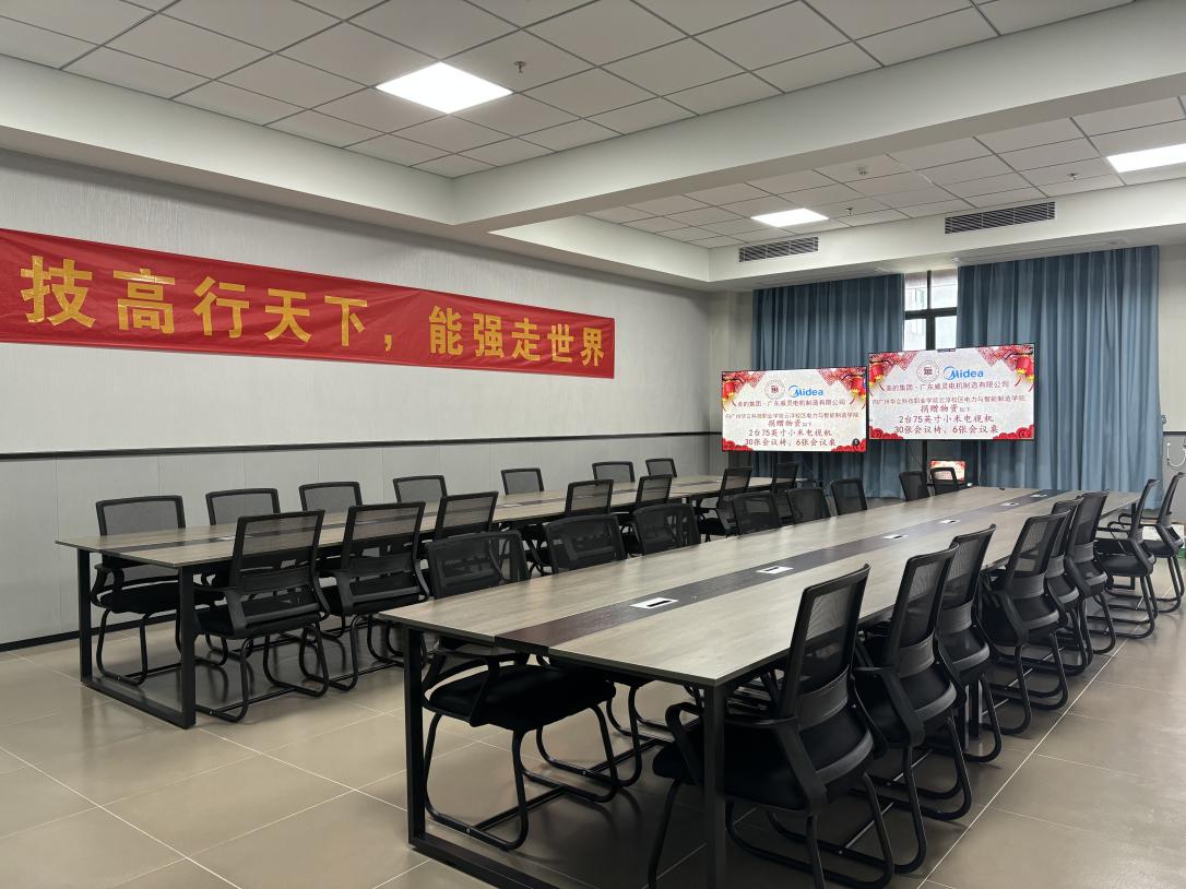 本次捐赠的技能大赛培训设备有两台75英寸小米电视机、六张大会议桌、三十张会议椅。