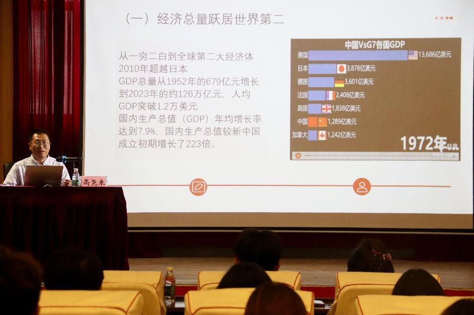 讲座伊始,高尧来副校长引用习近平总书记在党的二十大报告中的重要讲话“从现在起,中国共产党的中心任务就是团结带领全国各族人民全面建成社会主义现代化强国、实现第二个百年奋斗目标,以中国式现代化全面推进中华民族伟大复兴。”指出,全面推进中华民族伟大复兴是新时代中国共产党的中心任务。随后,他通过新中国成立以来的经济腾飞、科技突破、民生改善、国际地位提升等方面的成就,深刻剖析了中华民族从站起来、富起来到强起来的伟大跨越,强调这些成就的取得离不开党的领导、中国特色社会主义道路的指引和人民的不懈奋斗。