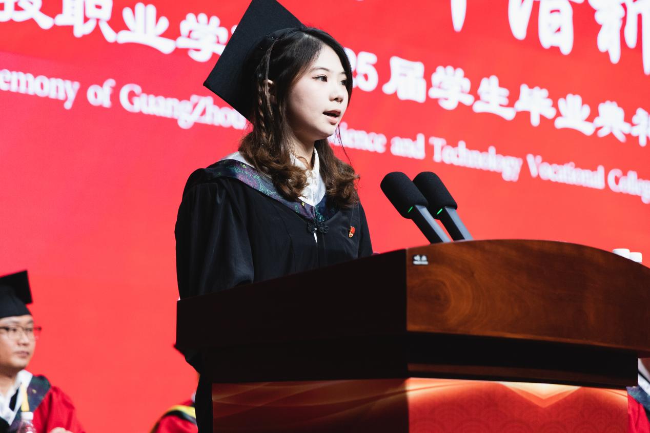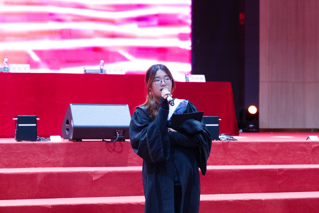 优秀毕业生代表刘宇诗讲述了自己在校学习期间的收获与感悟,“那些欢笑与汗水交织的日子,早已成为生命中最温暖的印记。”她深情回顾成长故事并致谢辛勤付出的师长们和并肩奋斗的同窗伙伴们。她表示,将带着老师们的谆谆教诲和殷切期望,带着同学们的鼓励和支持,勇敢地迈向未来。