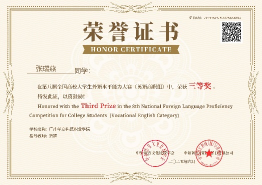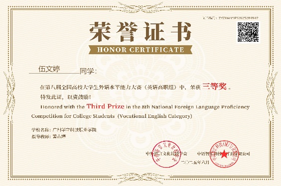 本届大赛吸引了全国数百所高职院校的数千名选手参与,赛事涵盖听力、阅读、写作、翻译及综合应用等多维度考核,全面检验学生的外语综合能力。我校姚沛珊同学(指导教师:房豫)以出色的语言表达能力和跨文化交际素养荣获全国一等奖;张瑞燕、徐亮和伍文婷三位同学(指导教师:房豫、黄志婷)凭借稳健发挥,分别斩获全国三等奖,充分展现了我校外语教学的高水平和学生卓越的专业素养。