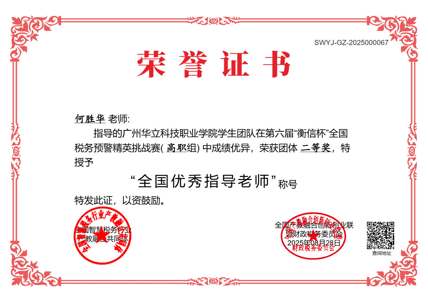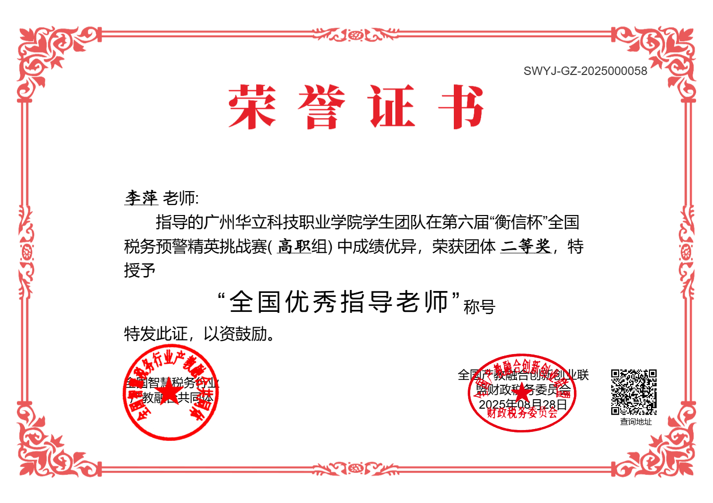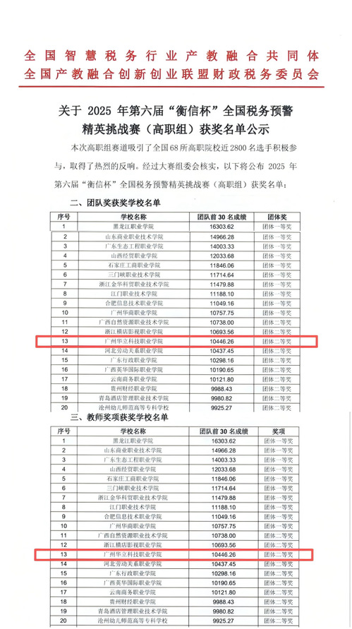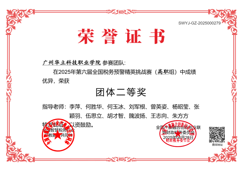 近日,历时22天赛程的第六届全国税务预警精英挑战赛(高职组)圆满落幕。广州华立科技职业学院经管学院学生参赛代表队凭借出色表现,荣获团体二等奖。