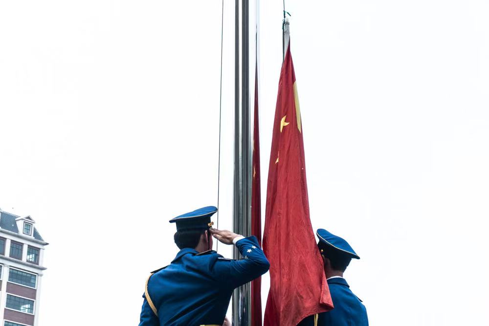 在庄严的《义勇军进行曲》中,升旗手振臂扬起五星红旗,全体师生肃立注目,注视着国旗在晨光中冉冉升起,浓厚的爱国情怀在每个人心中激荡。