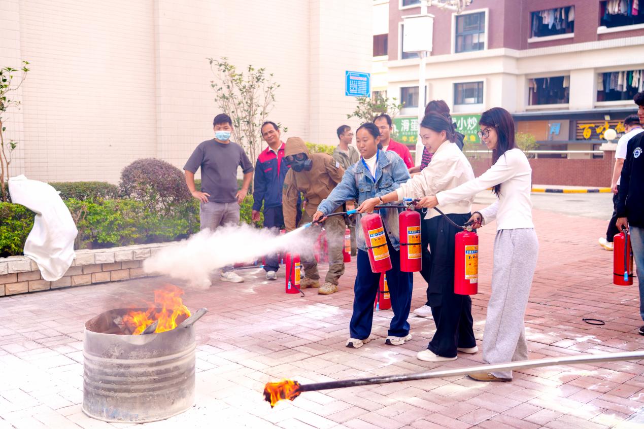 此外,现场还设置了油盆灭火项目,参训人员分组使用灭火器进行实战扑救。大家严格遵循“提、拔、握、压”的操作要领,瞄准火源根部喷射,迅速控制火势。演练中还模拟了突发风向变化等复杂情况,锻炼人员灵活应对能力。整个过程注重安全距离把控与团队协作,参训人员通过反复练习,熟练掌握了初期火灾扑救技能,切实提升了自救互救能力。