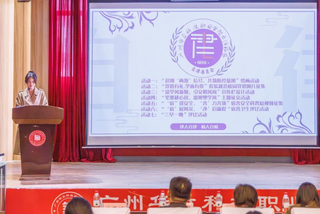随后,自律委员会指导老师甘芳婷上台宣读第三届“遵纪尚学”学风建设月系列活动,具体包括:一、“识别‘两热’信号,共筑防控蓝图”绘画活动;二、“穿搭有礼,学而有仪”着装规范校园穿搭图片征集;三、“设学风新貌,引文明风尚”宣传栏设计活动;四、“笔墨耕心田,思辨塑学风”主题征文活动;五、“‘宿”说安全,‘舍’力共筑”宿舍安全科普短视频征集;六、“‘宿’展风采,‘净’启新程“宿舍卫生评比活动;七、“三早一晚”评比活动。