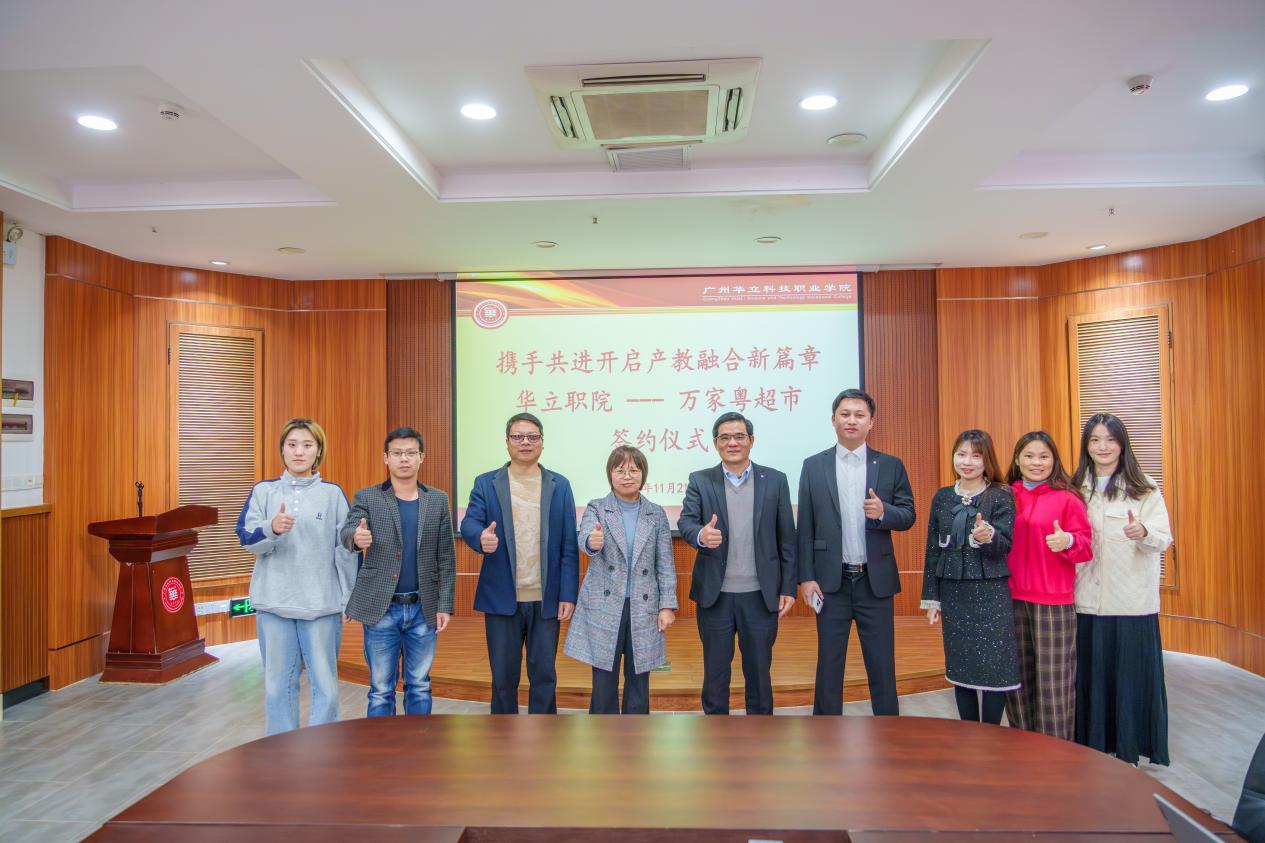 在热烈的掌声中,万家粤超市总经理林坤烁与华立职院经管学院副院长刘军根共同签署了校企合作协议,标志着双方合作正式启动。