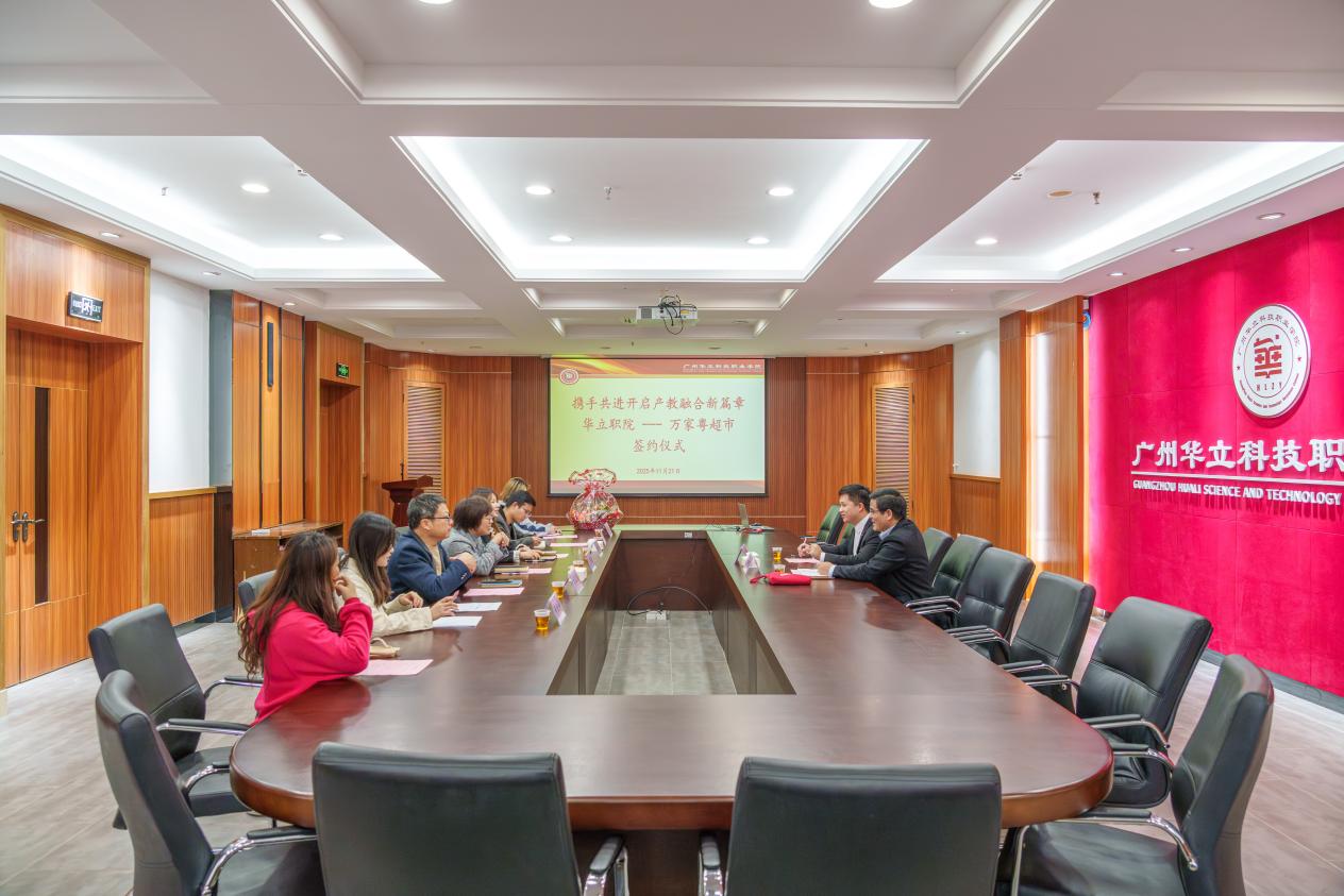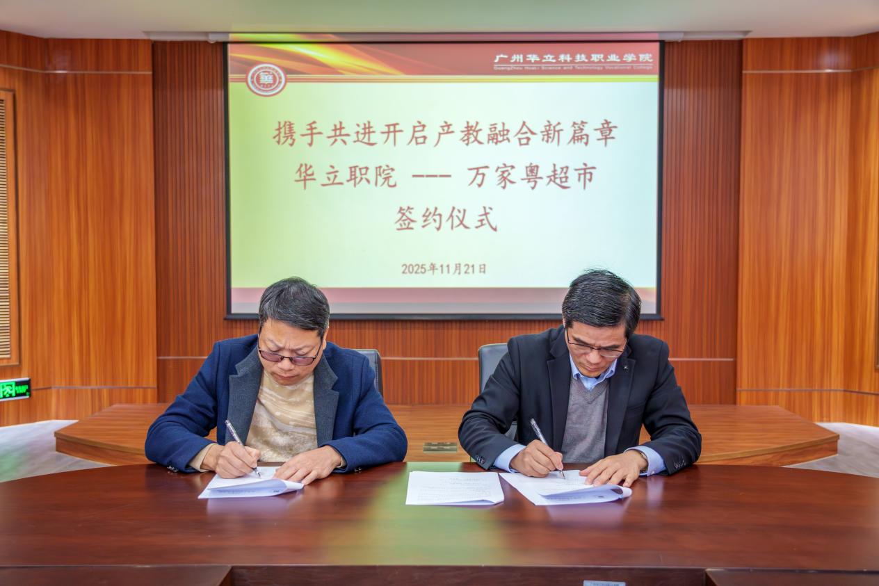 2025年11月20日,广州华立科技职业学院与云浮市万家粤超市有限公司在云浮校区图书馆一楼会议室举行以“携手共进,开启产教融合新篇章”为主题的校企合作签约仪式。万家粤超市总经理林坤烁、企划部经理林暑佳,广州华立科技职业学院党委副书记、副校长王洪艳,经管学院副院长刘军根、学校办公室副主任林子云、党委宣传部副部长刘广等校企代表出席仪式。
