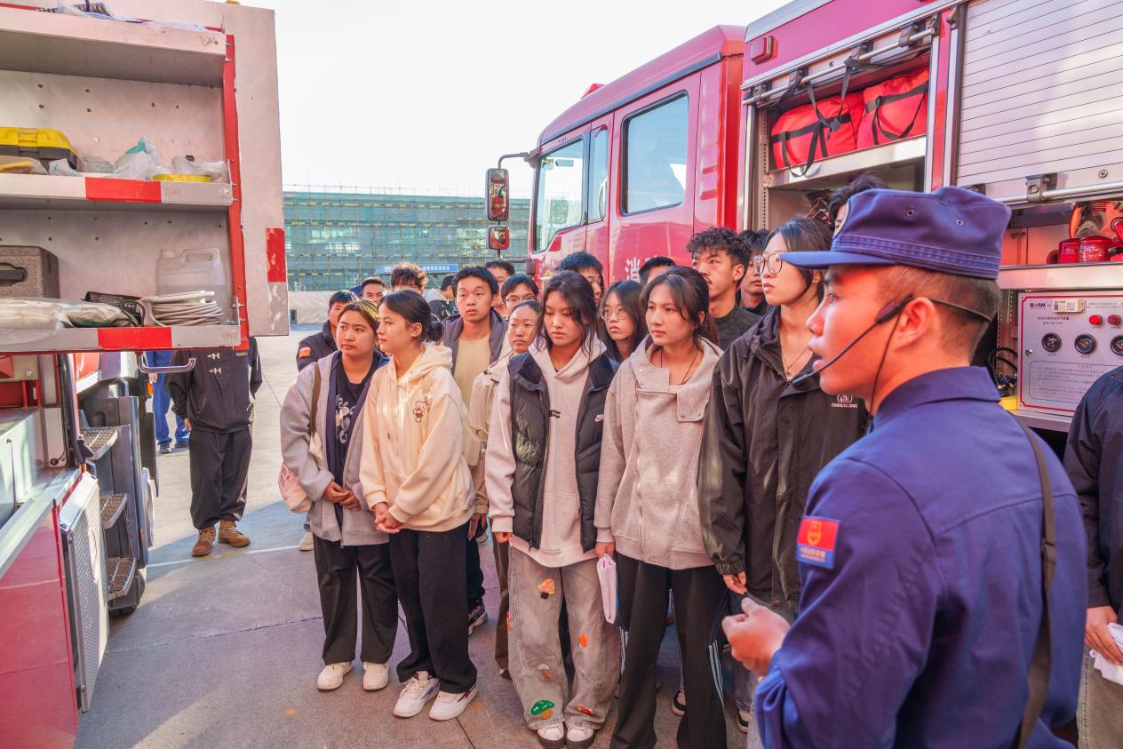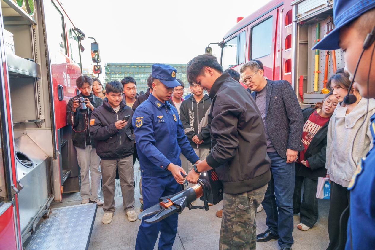 活动伊始,华立师生一行受到副队长郭本阳及全体消防指战员的热烈欢迎。在消防员彭颖锋的引导与讲解下,同学们依次参观了整洁的营区、装备器材库及各类消防车辆。面对云梯车、高喷车、抢险救援车等专业车辆,以及液压破拆工具、无齿锯、生命探测仪、空气呼吸器等救援装备,同学们表现出浓厚兴趣,不时驻足提问。消防员详细介绍了装备的性能与用途,并现场演示操作,让大家直观感受到现代化消防装备在应急救援中的重要作用。