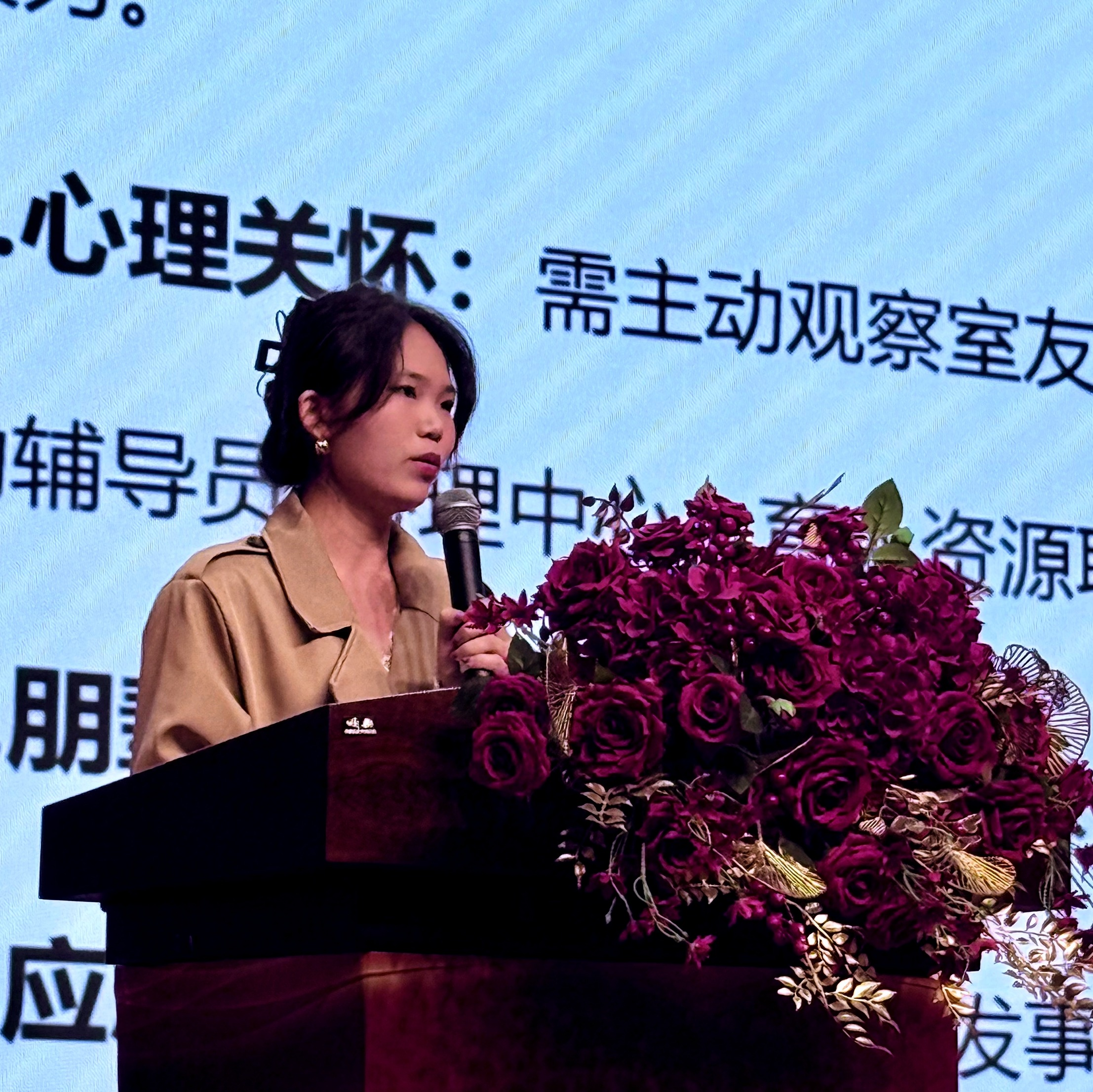 在首场专题培训《安全“宿”守,责任在肩》中,生活指导科甘芳婷老师围绕宿舍长的角色定位与突发事件应对展开讲解。她系统阐述了宿舍长作为“协调员、信息员、氛围营造者、心理关怀者、互助伙伴和应急先锋”的六大职责,结合真实案例,详细介绍了突发疾病、火灾险情、人际冲突等常见应急场景的处置流程。她强调,宿舍安全是校园稳定的基础,全体宿舍长应带头遵守用电规范、杜绝违禁电器、共建文明宿舍,切实守住“安全红线”。
