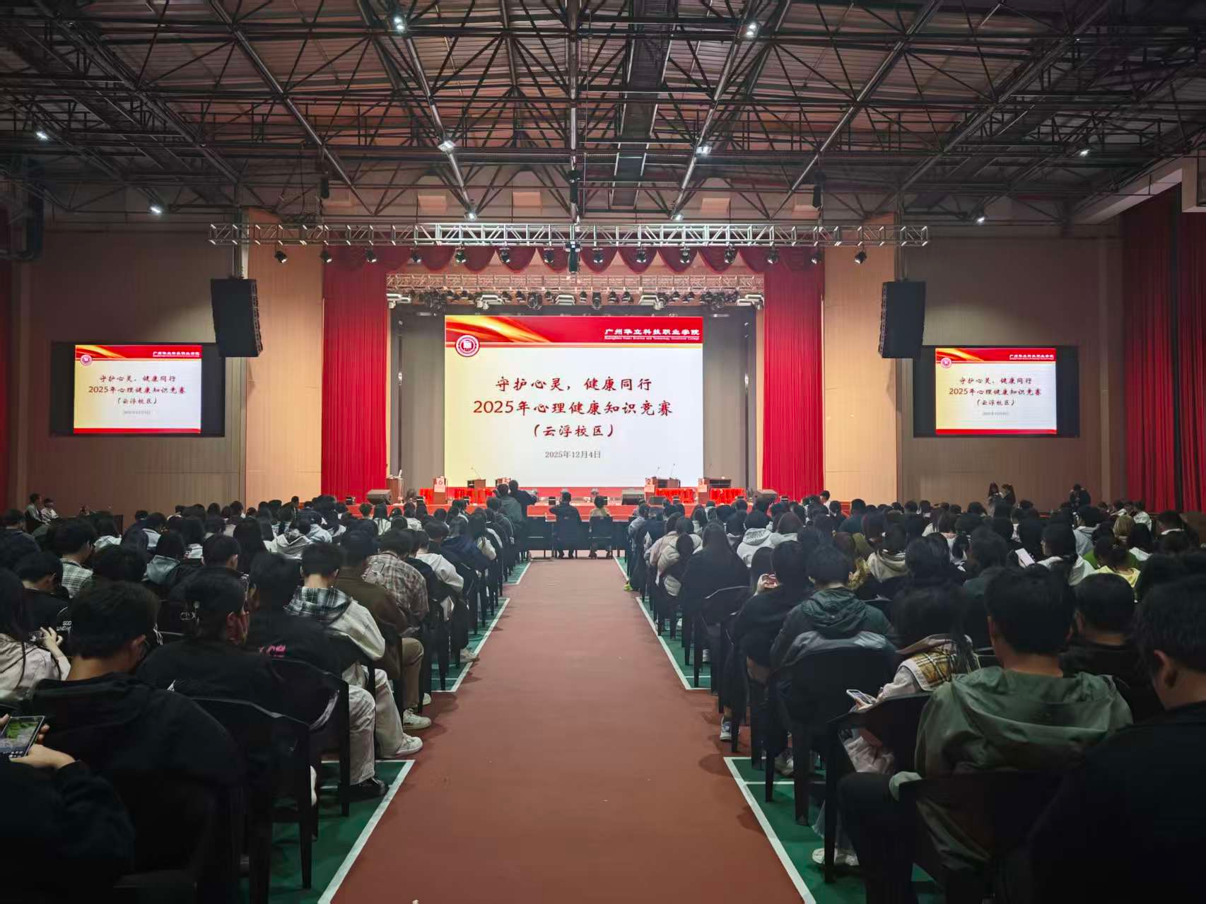 为普及心理健康知识,提升学生心理调适能力,营造积极健康的校园心理氛围,12月4日晚,2025年大学生心理健康知识竞赛团体赛在文体楼八楼成功举办。学生处副处长李同同、学生处处长助理杜盈盈、心理健康教育与咨询中心教师及各学院心理工作站负责人莅临现场,与近三百名师生共同见证这场知识与智慧的碰撞、心灵与成长的对话。