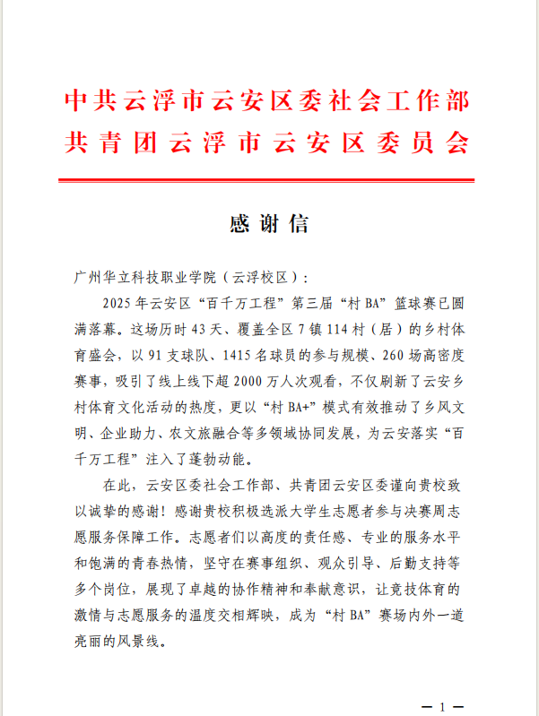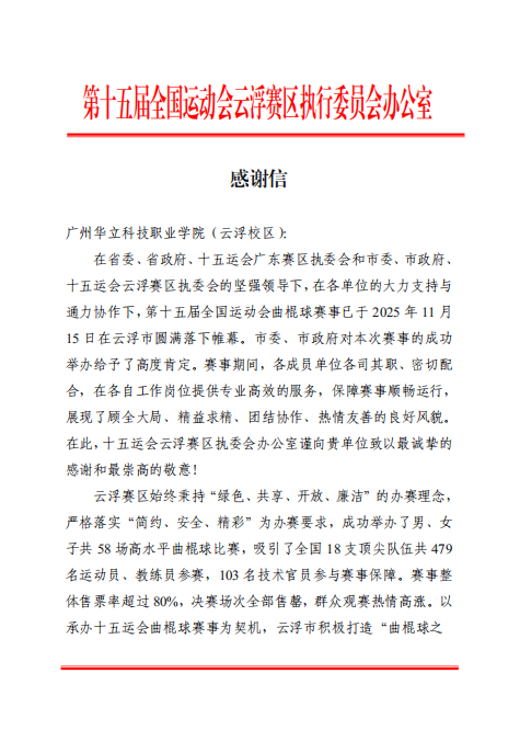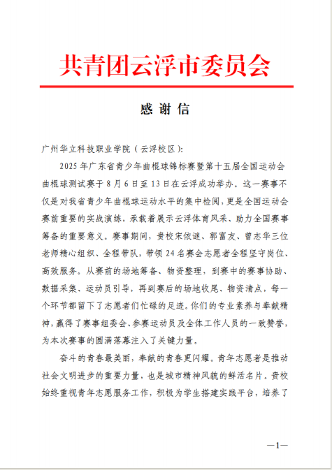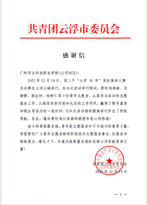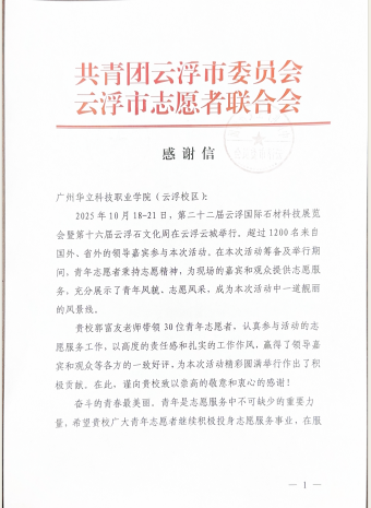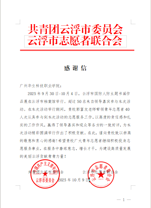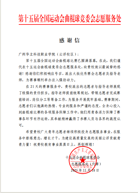 今年以来,广州华立科技职业学院青年志愿者团队积极投身云浮市多项大型赛事、文化活动与城市宣传服务之中,以专业、热情、高效的志愿服务,赢得了各主办单位及社会各界的广泛好评,充分展现了我校学子服务社会、奉献青春的优秀风貌。